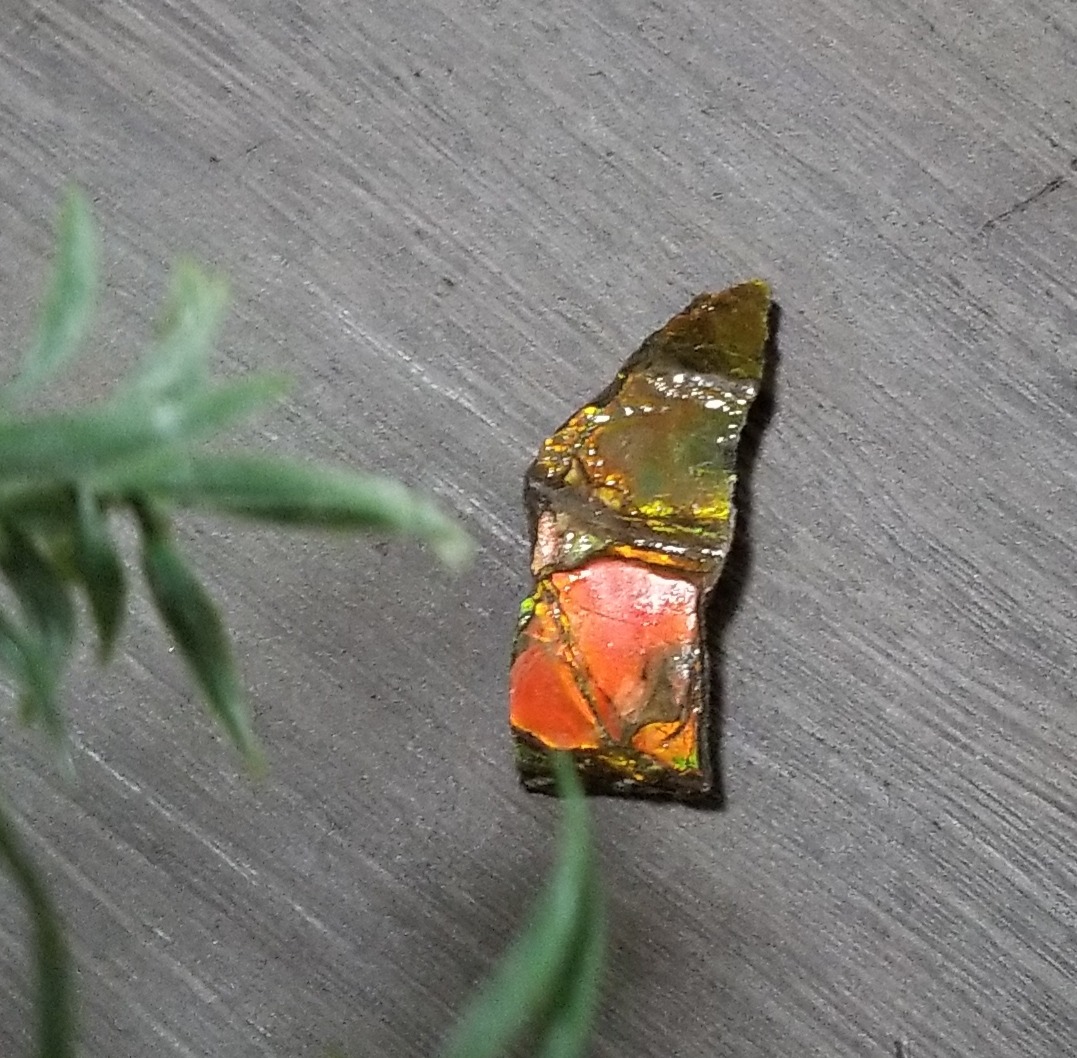 特別高価な訳でもなく、レアカラーでもないのですが、赤、金、緑の輝きはパッと明るく“映え”、アンモライトの王道と言えると思います。