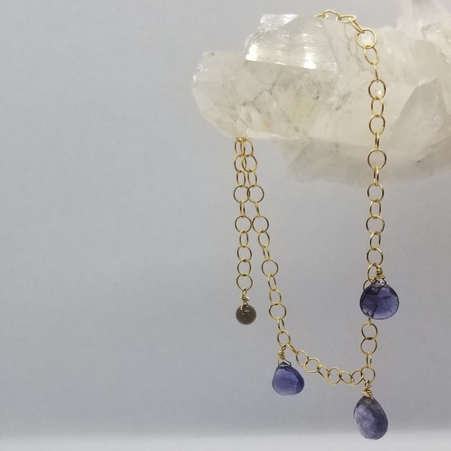 マロンカットアイオライトと14kgfデザインチェーンのブレスレットです。 長さは約20cmチェーンの内径が大きめなのでサイズ自在です。 青から紫の色味が美しい菫(スミレ)色アイオライトと14kgfのゴールドの落ち着いた組み合わせです。 天然石との “きっかけ” を、、、。