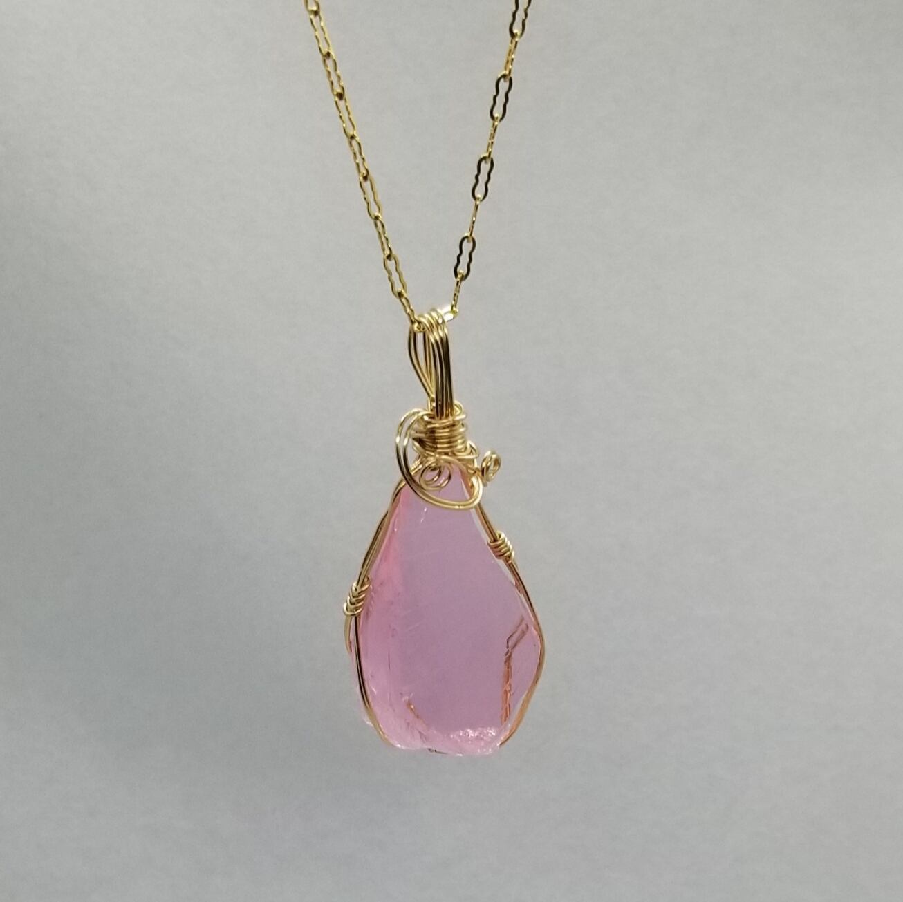 インドネシア産のクリアなピンクのアンダラクリスタルを14kgfワイヤーでネックレストップに仕立てました。