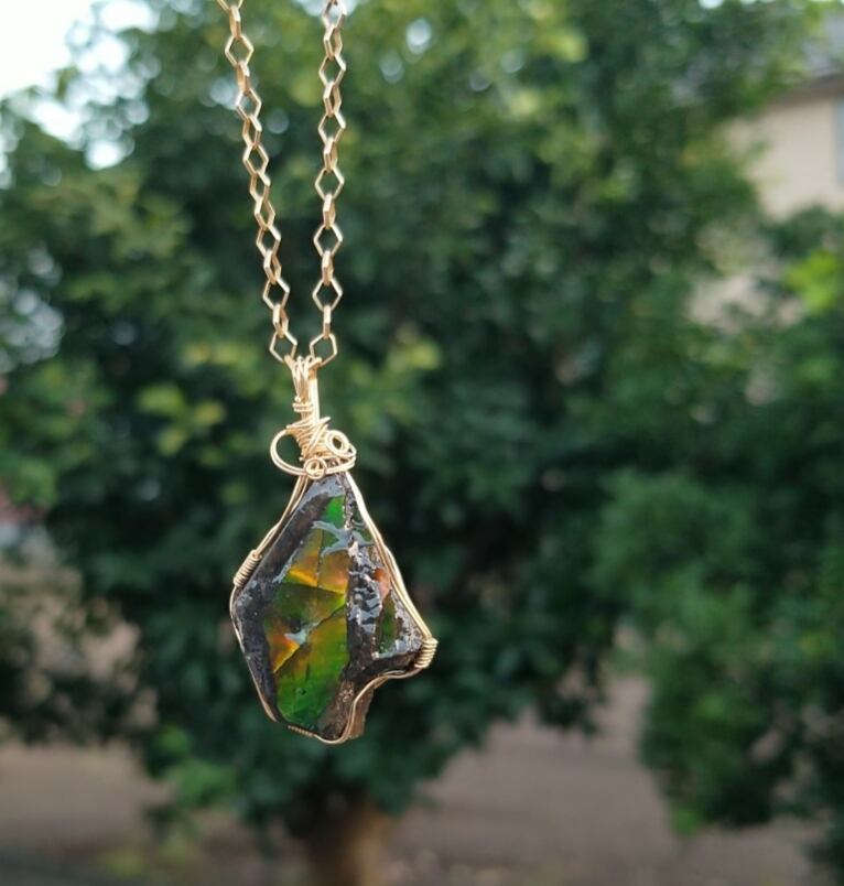 アンモライトの原石欠片を14kgfワイヤーでペンダントトップに仕立てました。