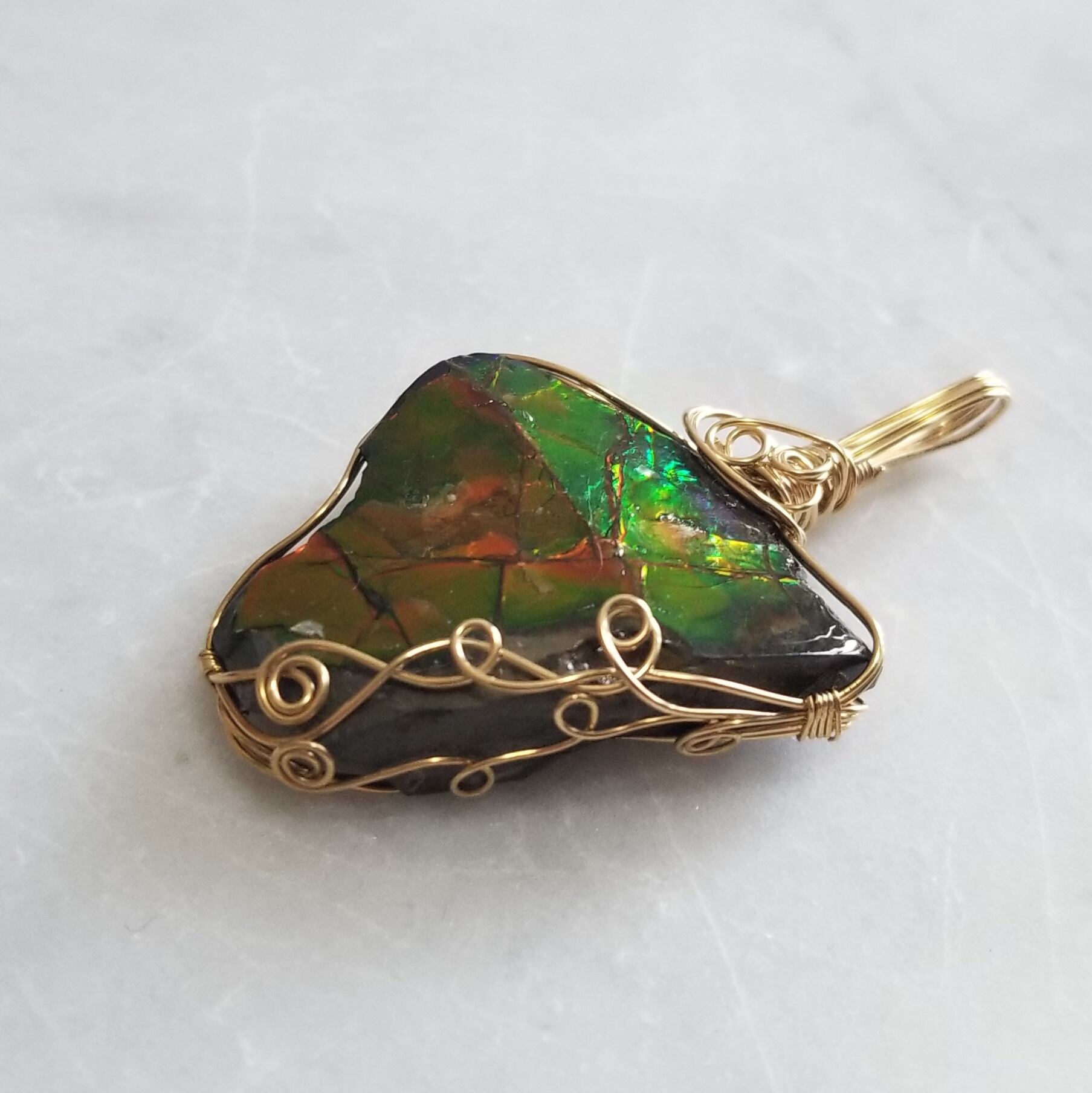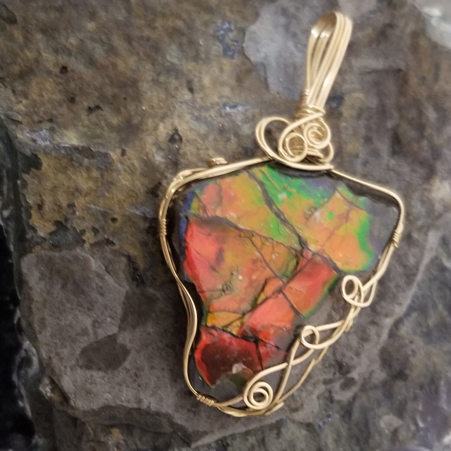 アンモライトの原石欠片を14kgfワイヤーでペンダントトップに仕立てました。