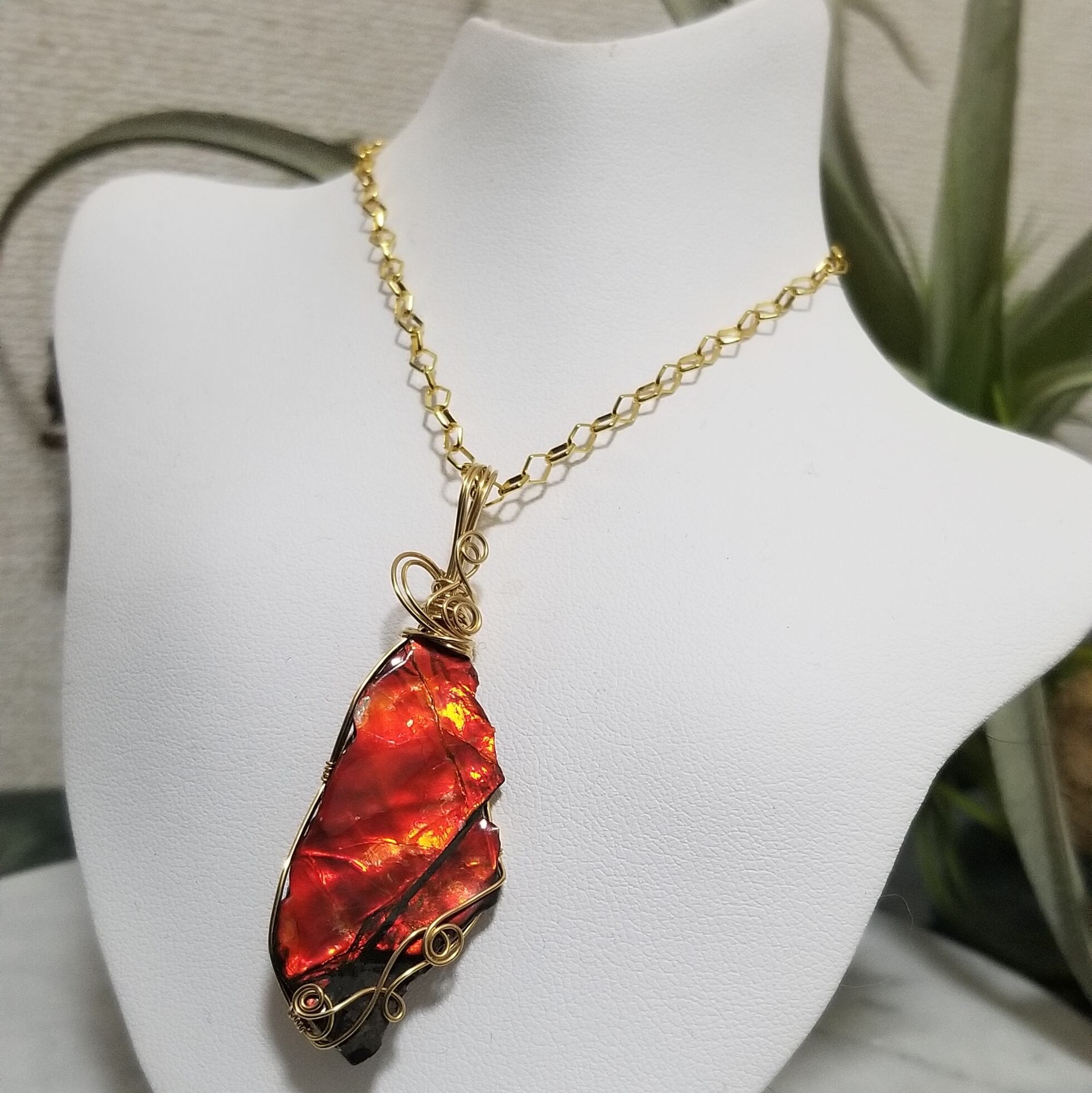 アンモライトは角度や明るさにより見える色が変化します。燃える赤色と鮮やかな緑色との融合や、光彩の瞬時の切り替わりをお楽しみいただけます。