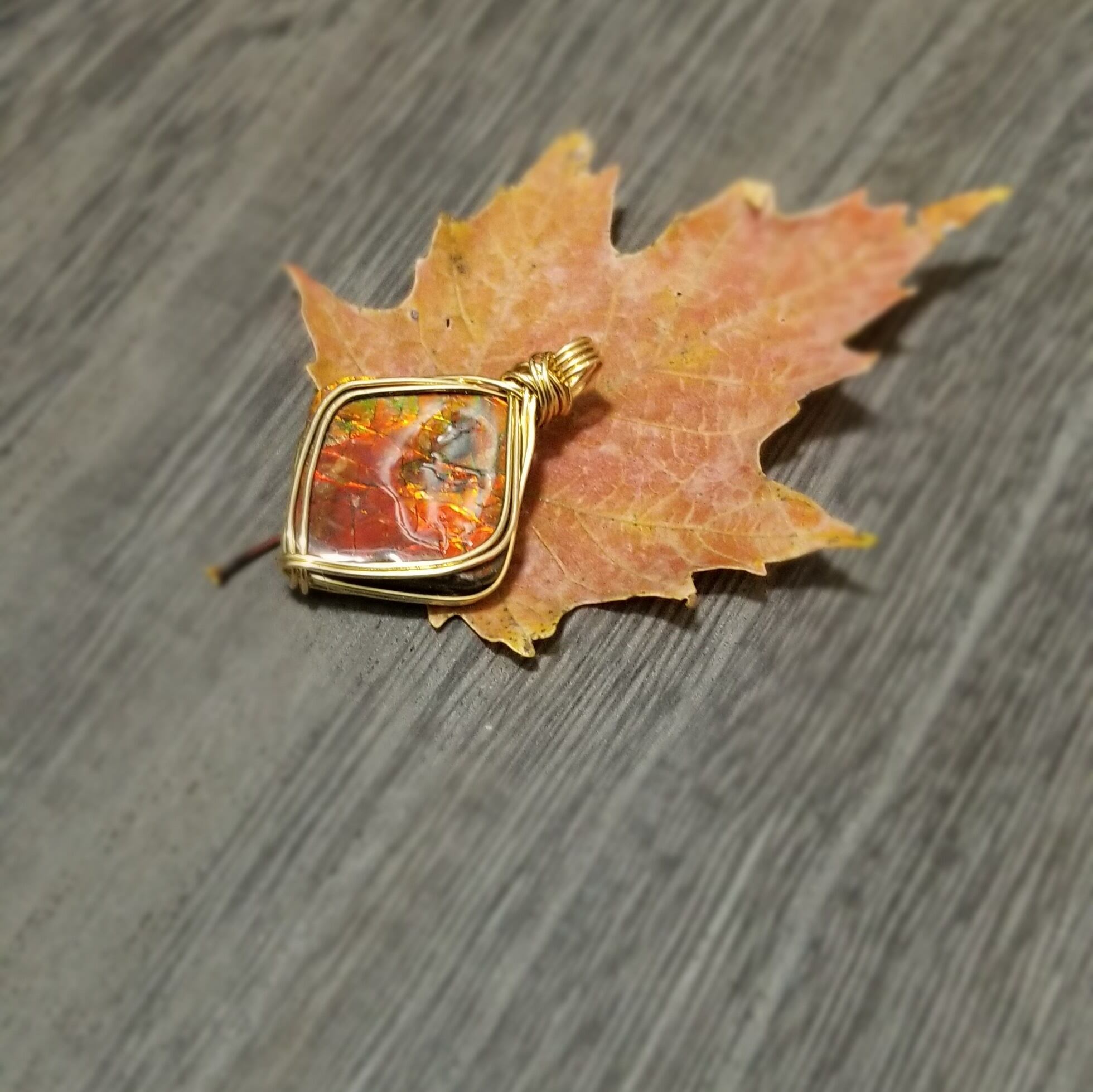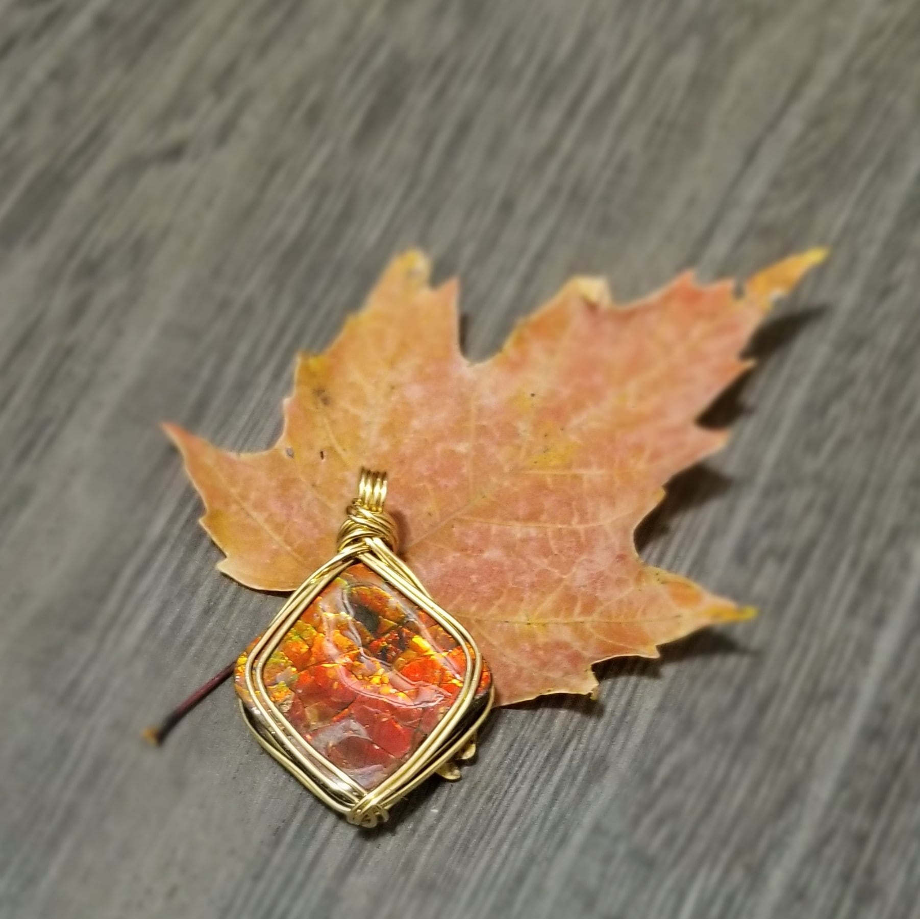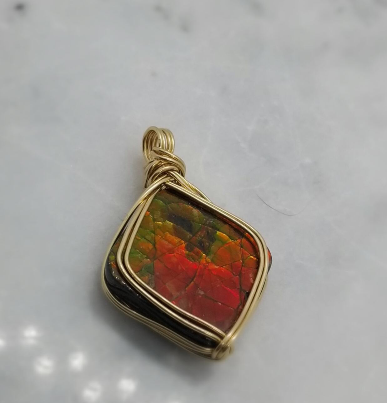 カナダ産のアンモライトを14kgfワイヤーでペンダントトップに仕立てました。