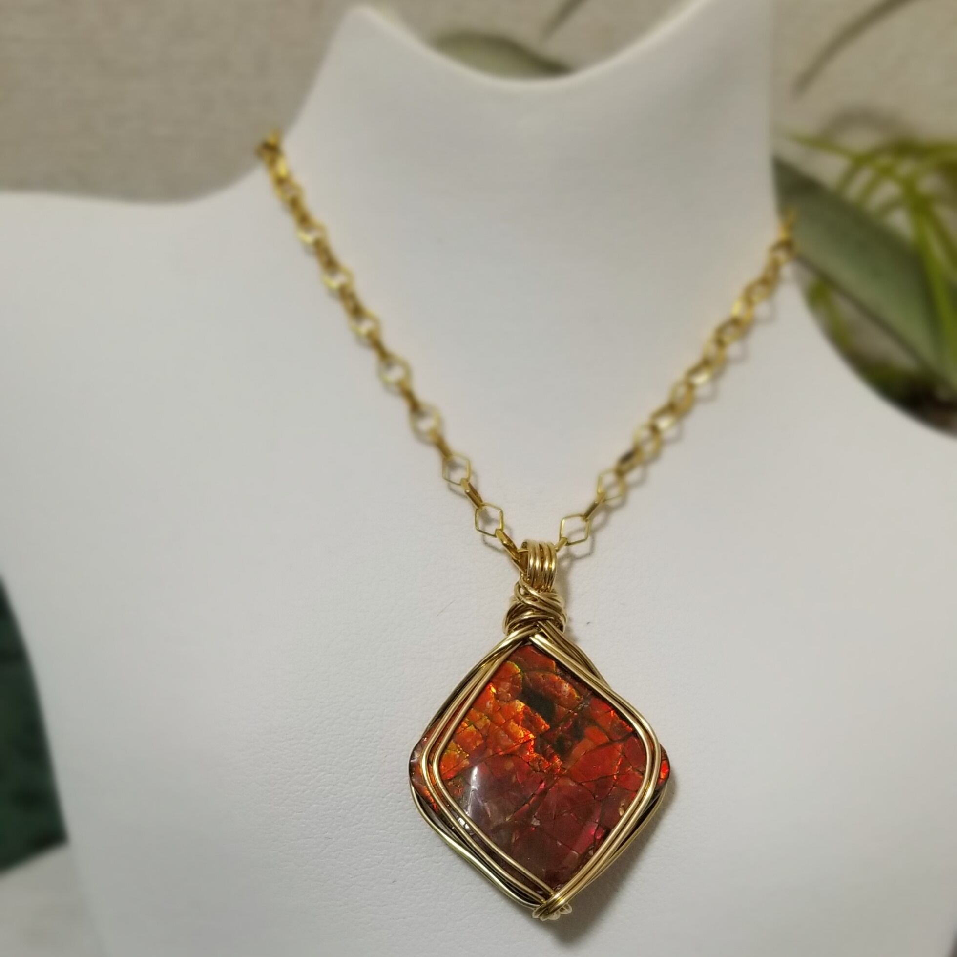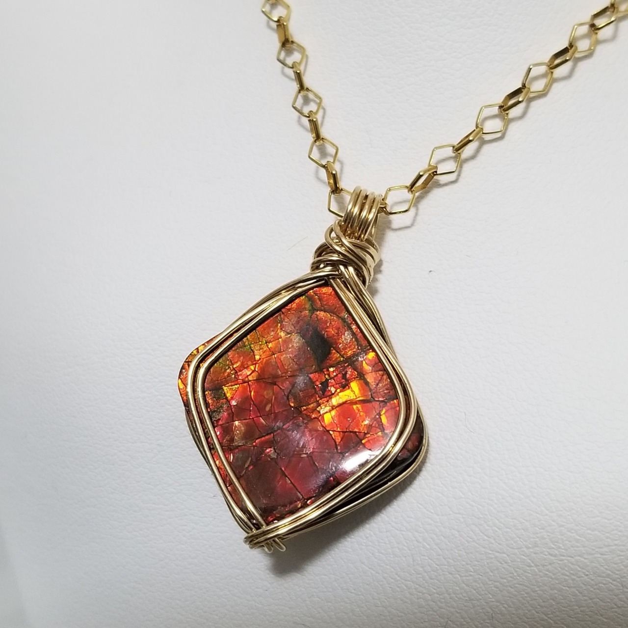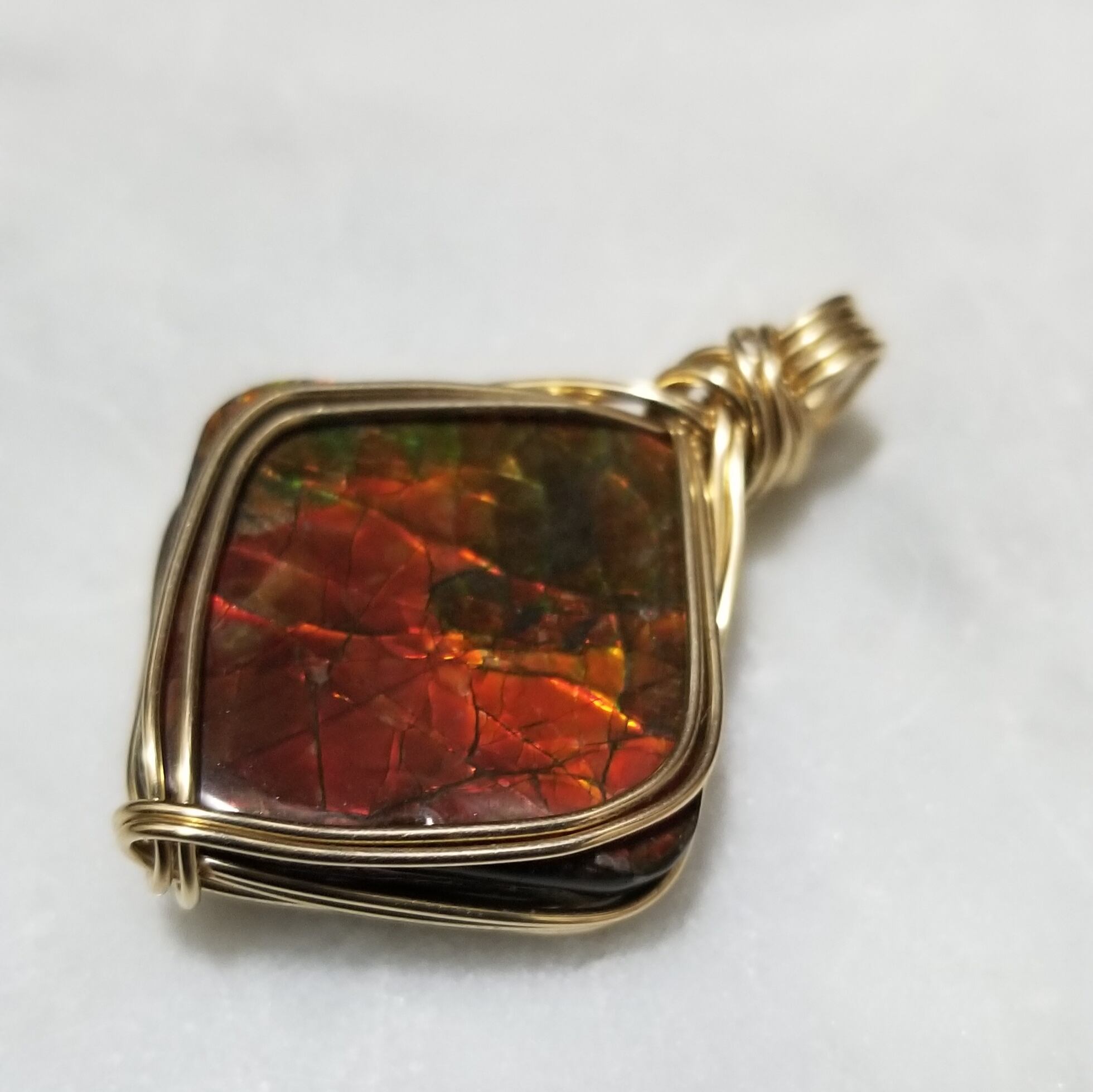カナダ産のアンモライトを14kgfワイヤーでペンダントトップに仕立てました。