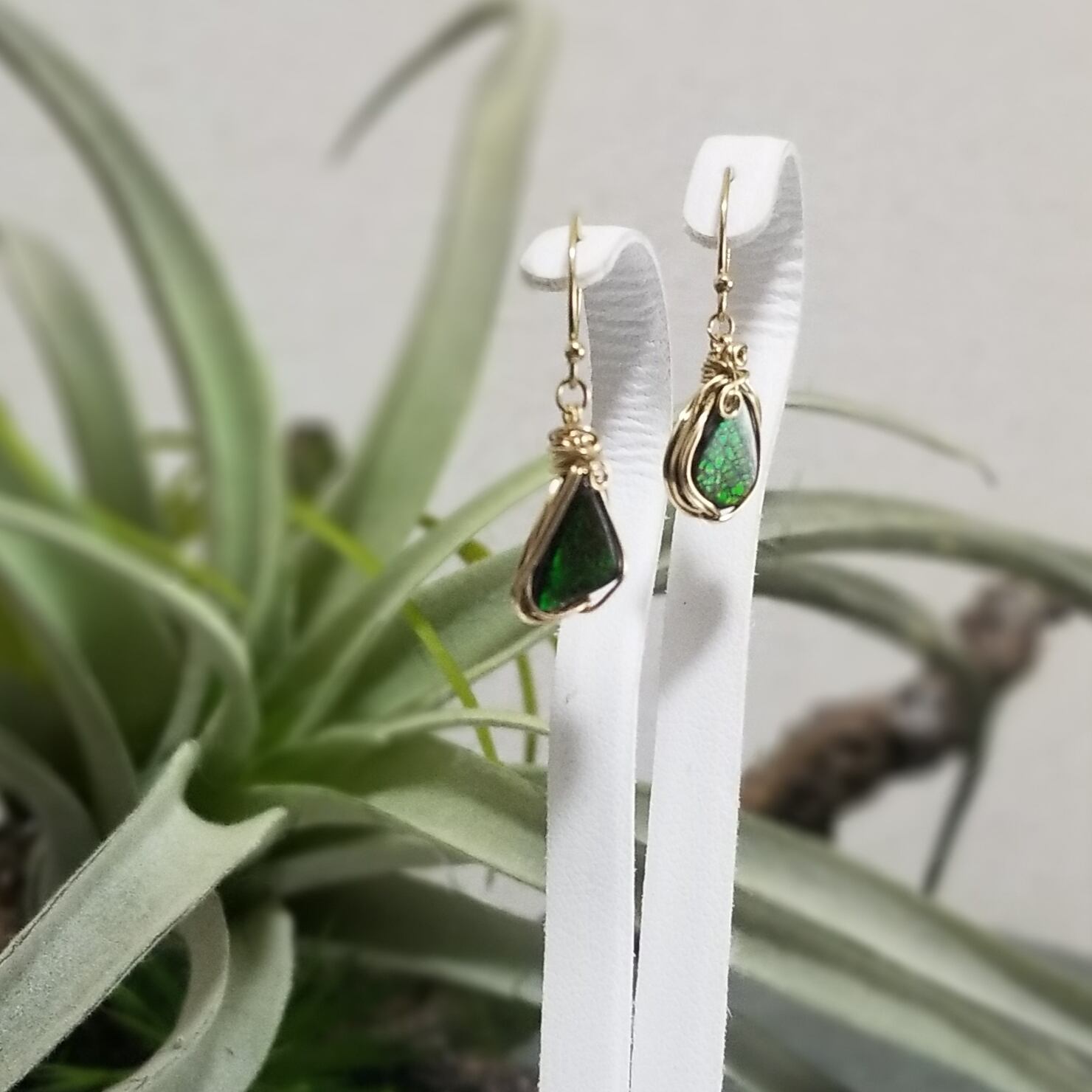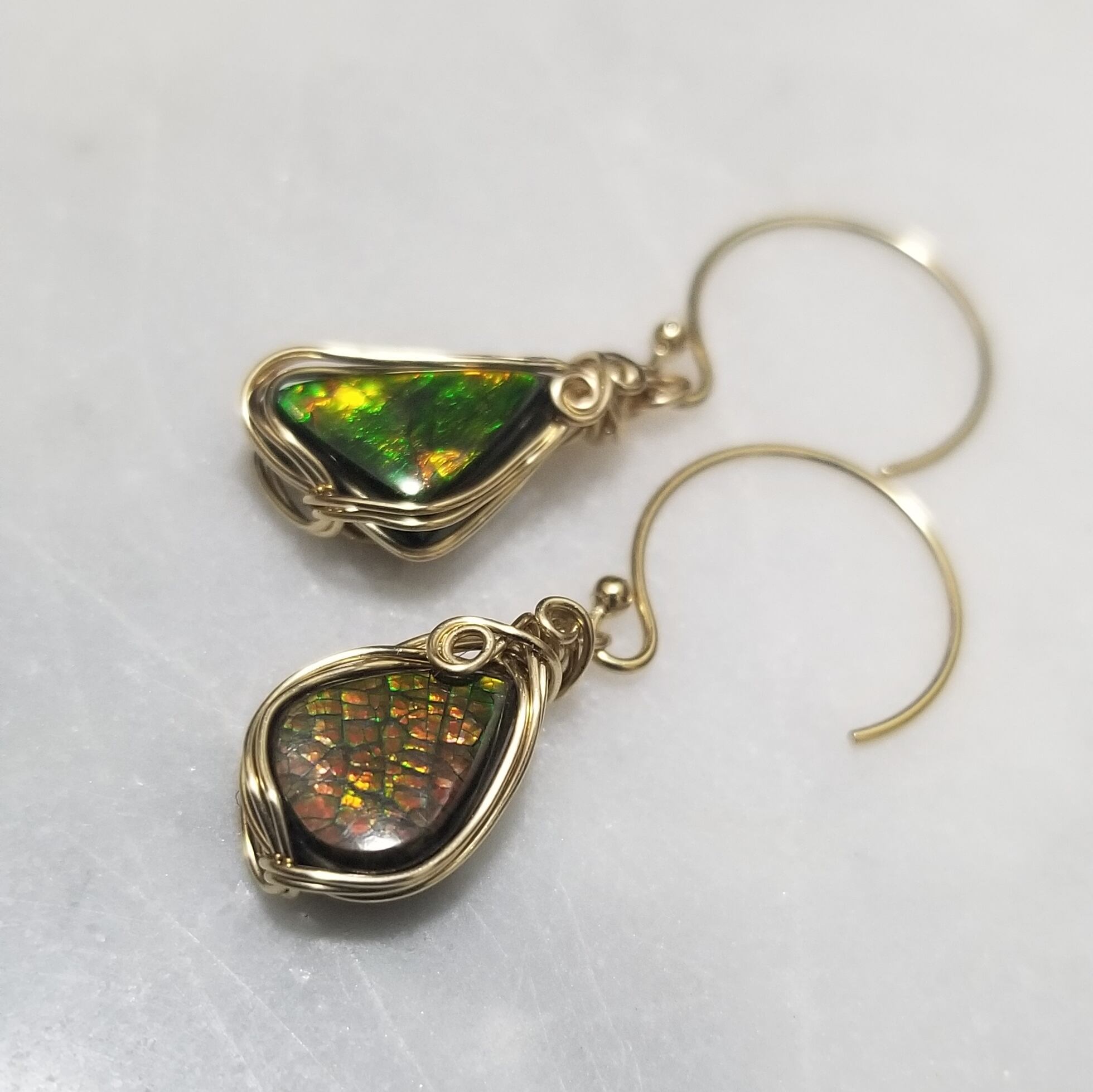 アンモライトナチュラルルースを14kgfワイヤーでピアスに仕立てました。