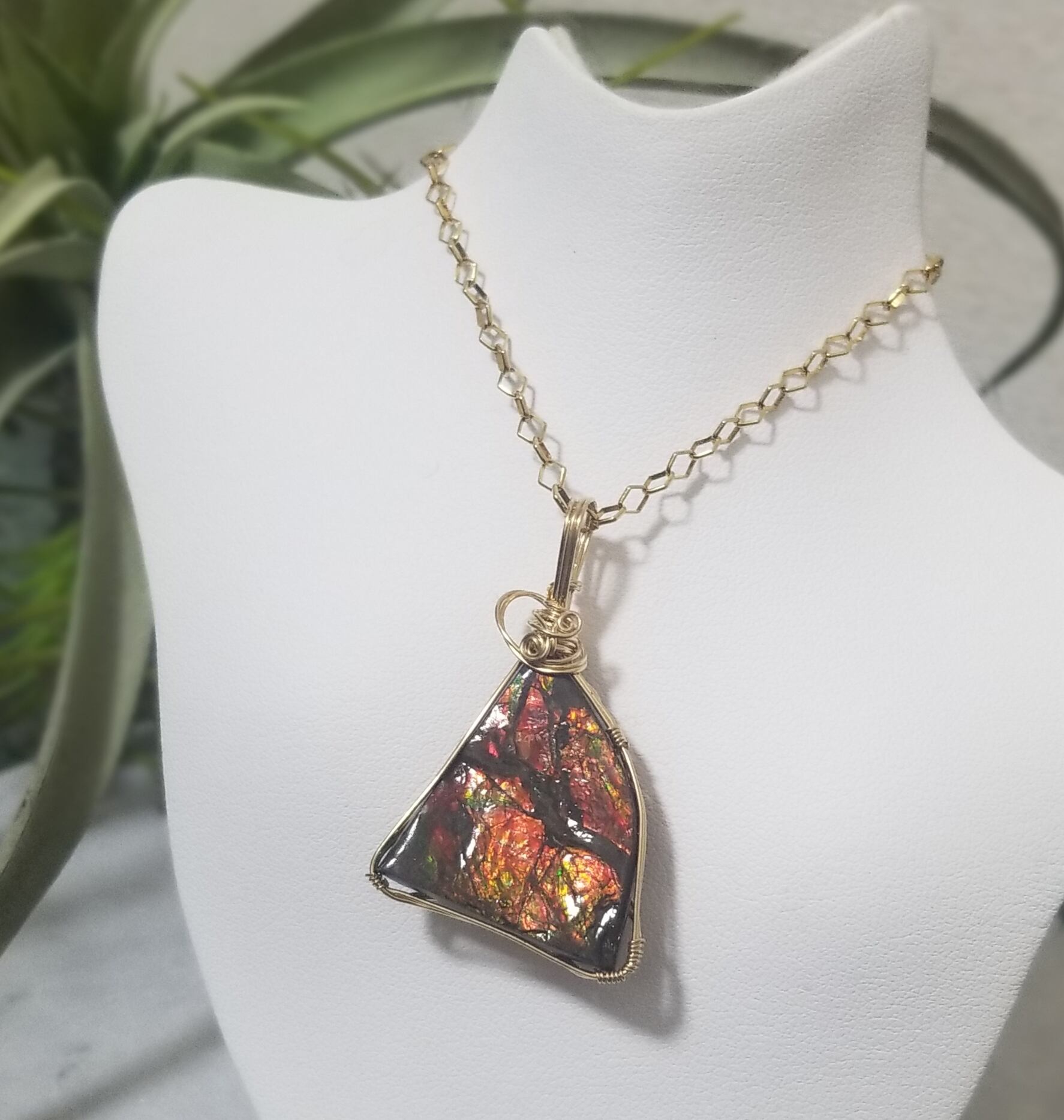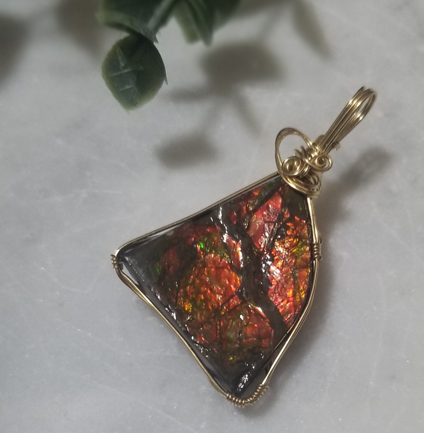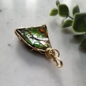 アンモライトの原石欠片を14kgfワイヤーでペンダントトップに仕立てました。