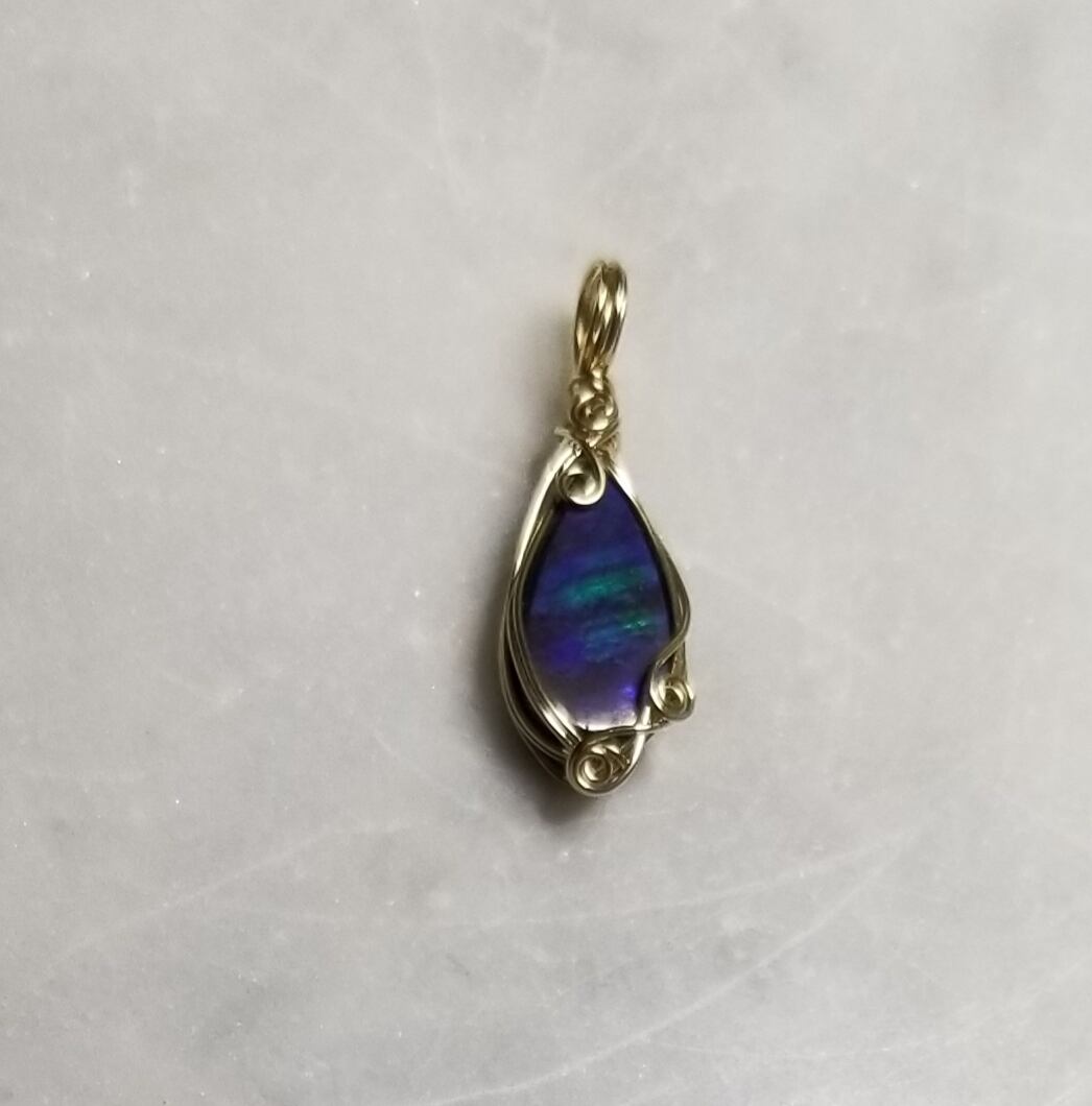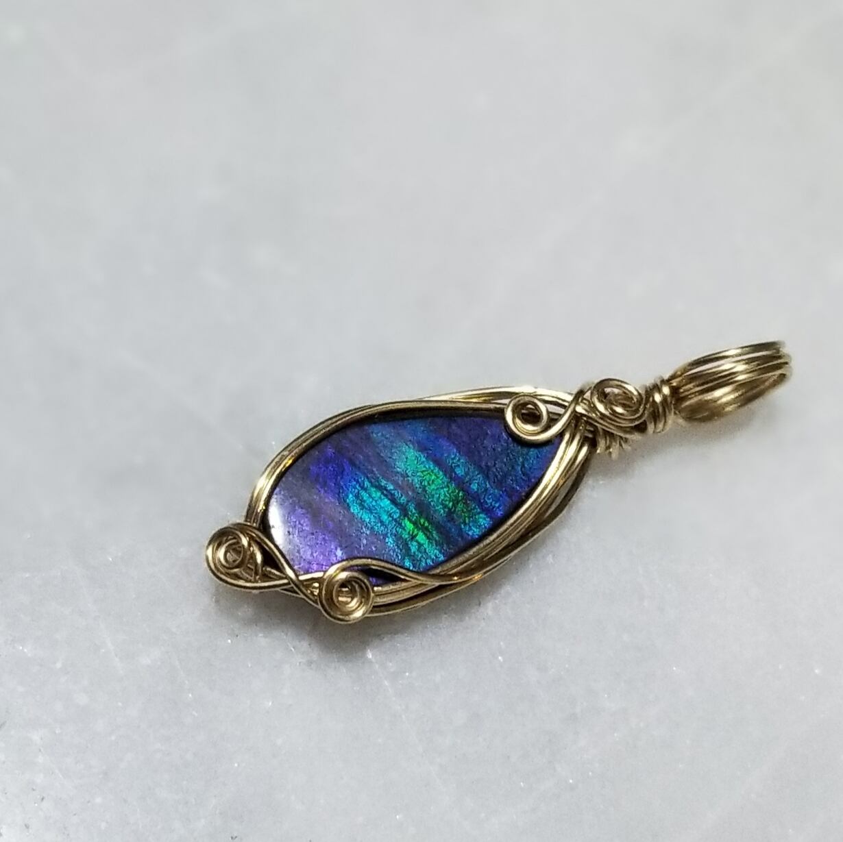 アンモライトナチュラルルースを14kgfワイヤーでペンダントトップに仕立てました。