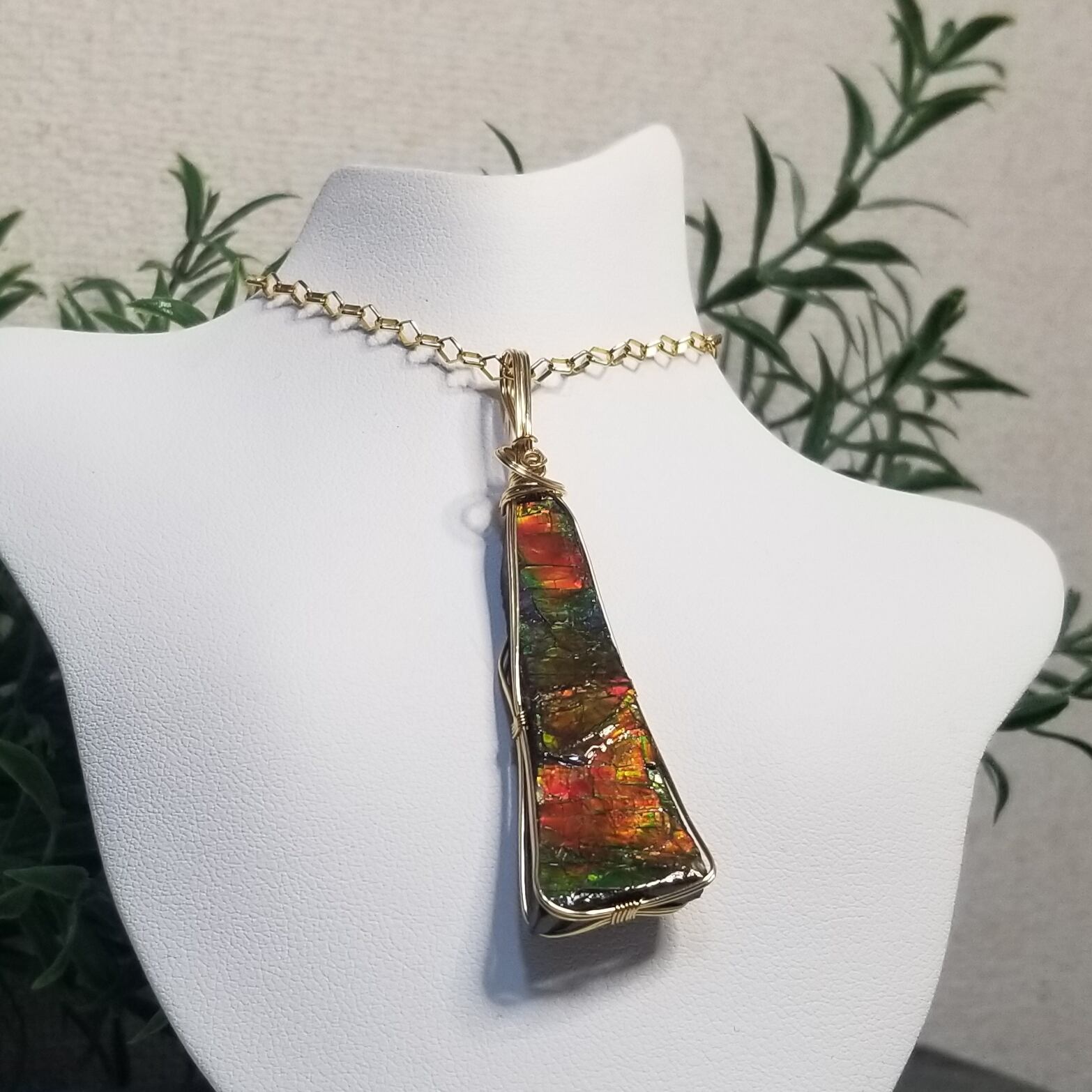 アンモライトの原石欠片を14kgfワイヤーでペンダントトップに仕立てました。