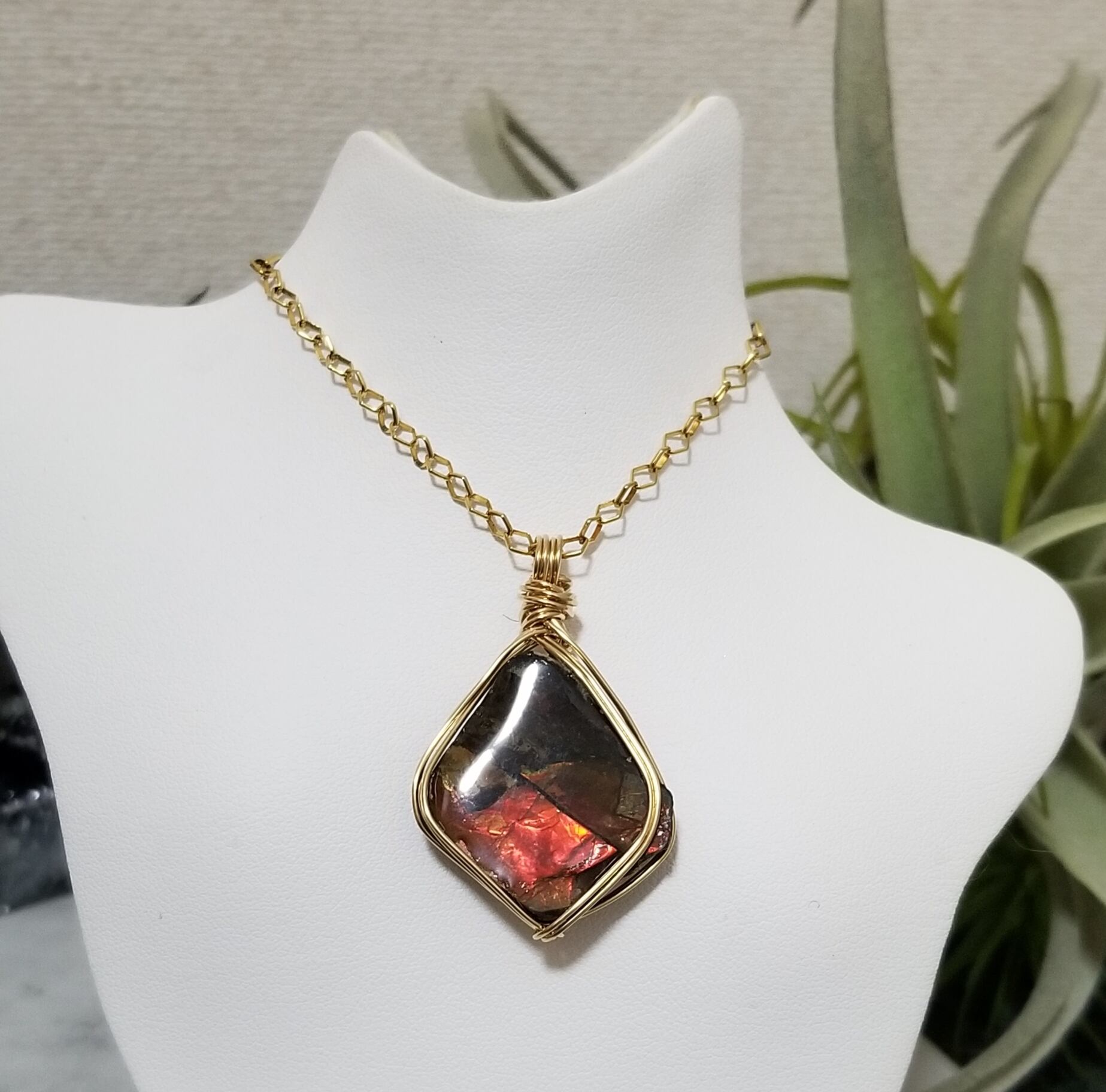 アンモライトの原石欠片を14kgfワイヤーでペンダントトップに仕立てました。
