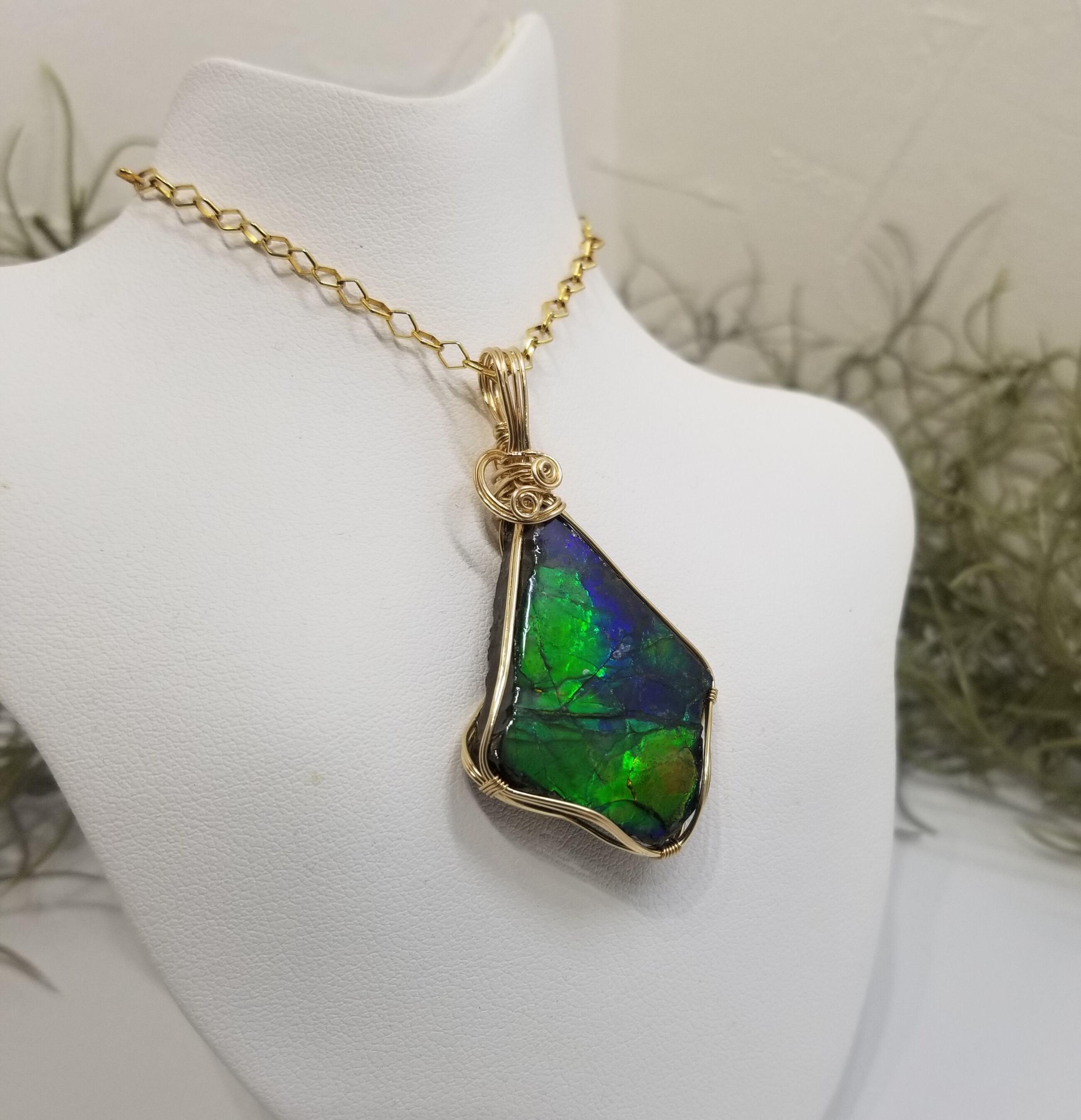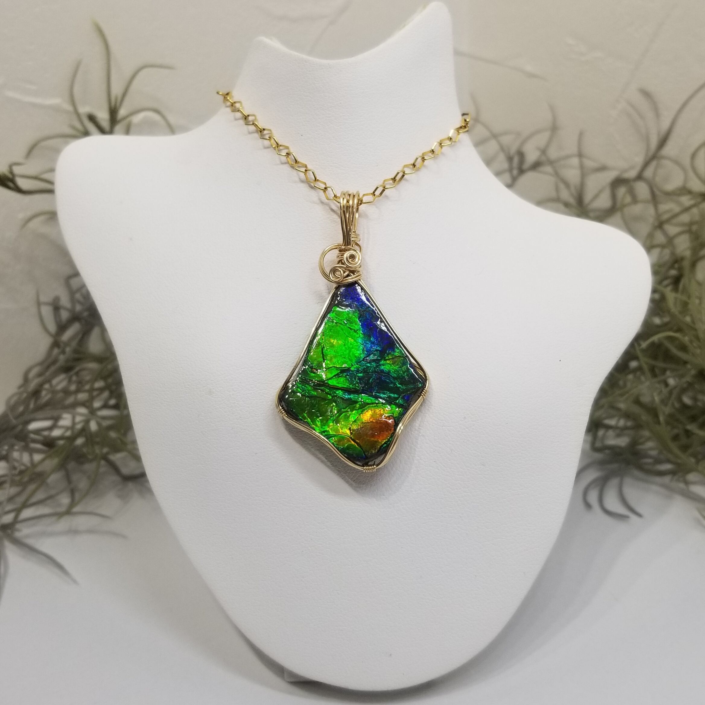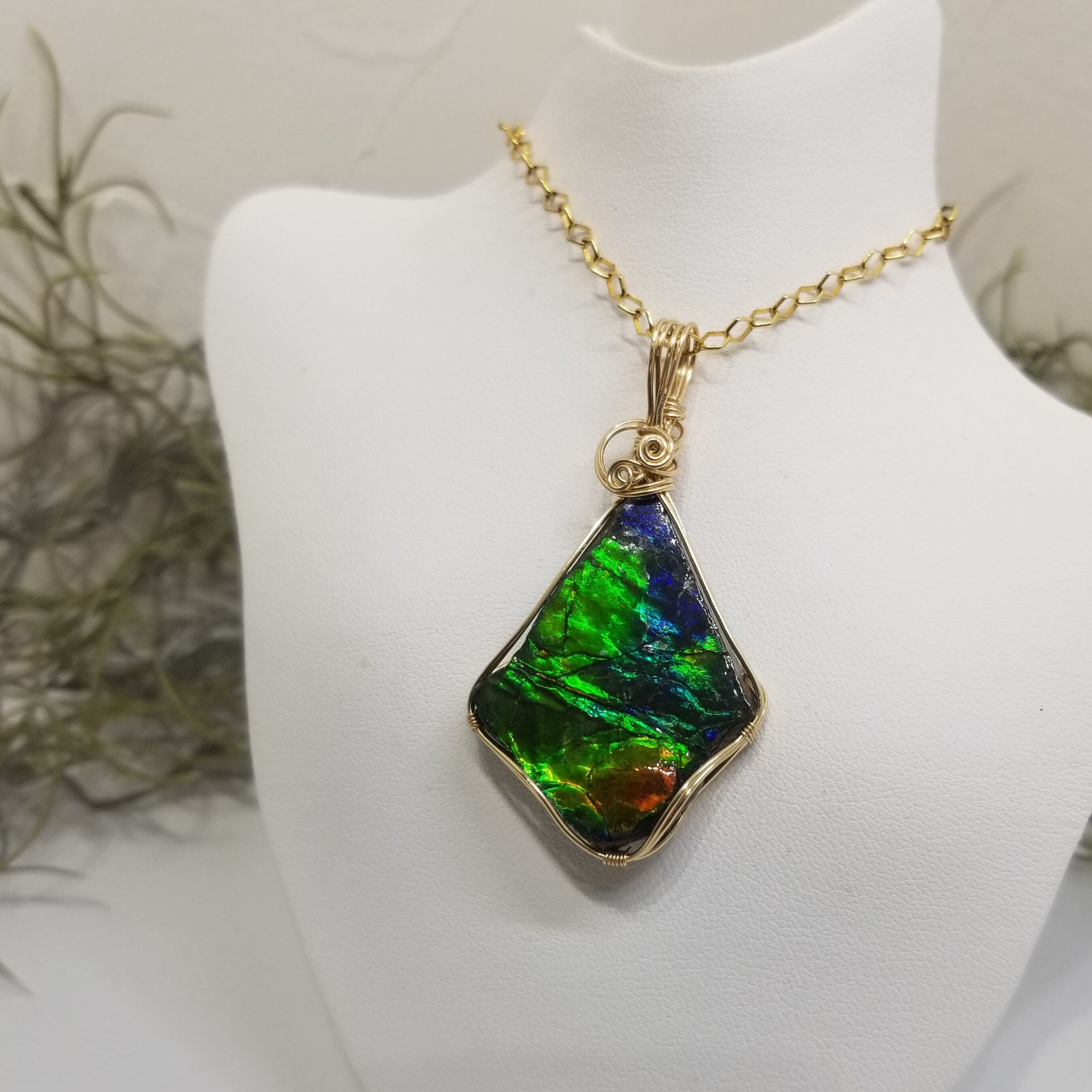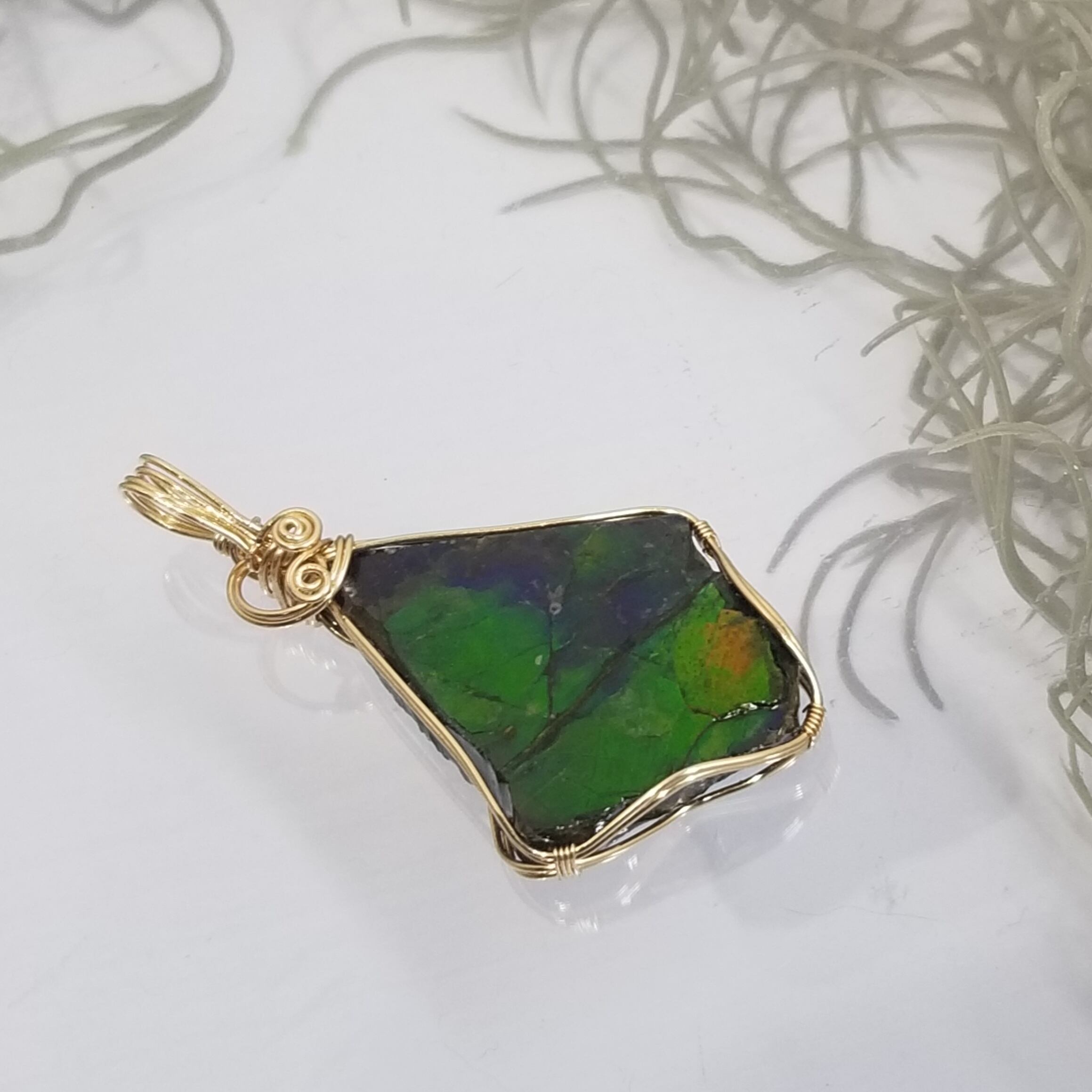 アンモライトの原石欠片を14kgfワイヤーでペンダントトップに仕立てました。