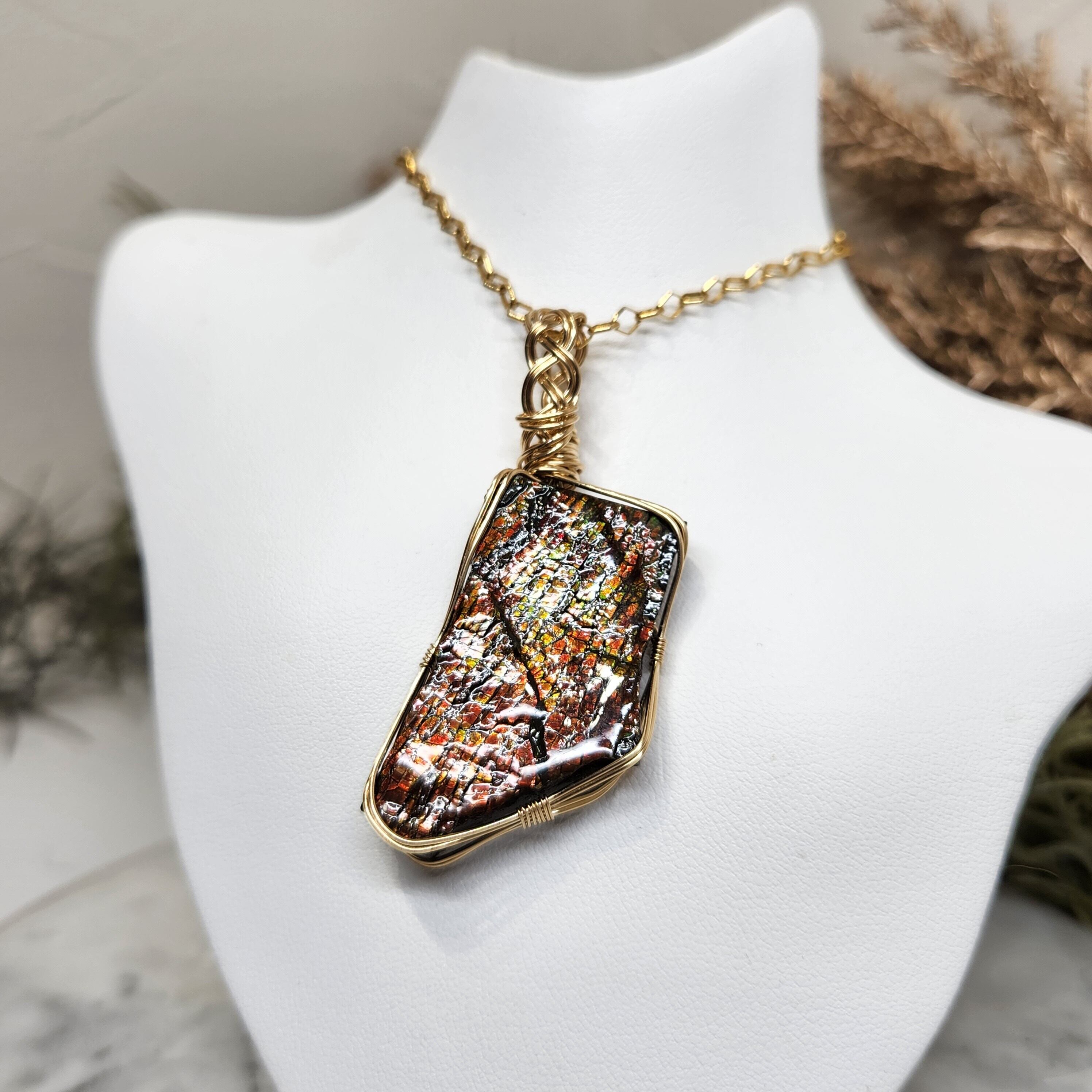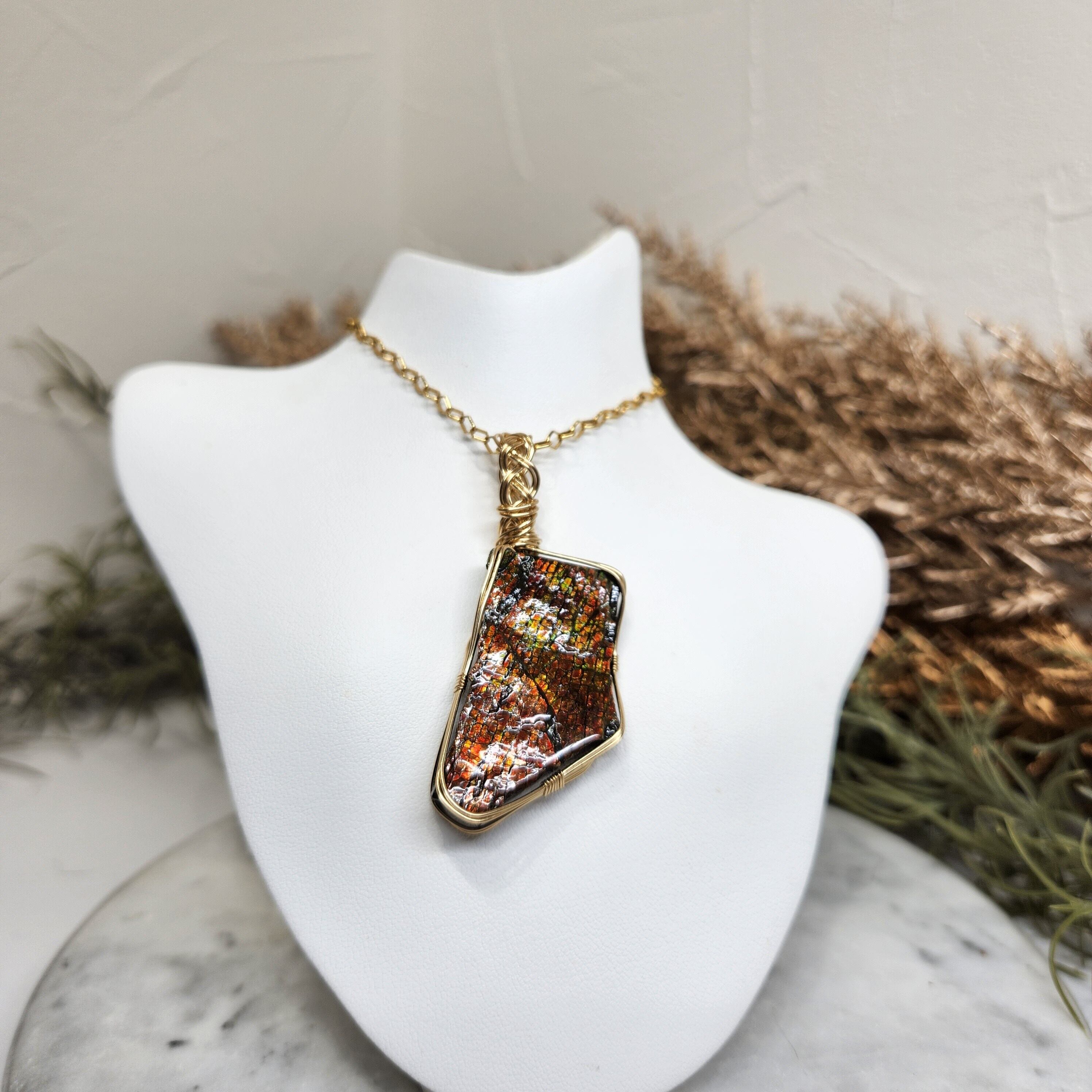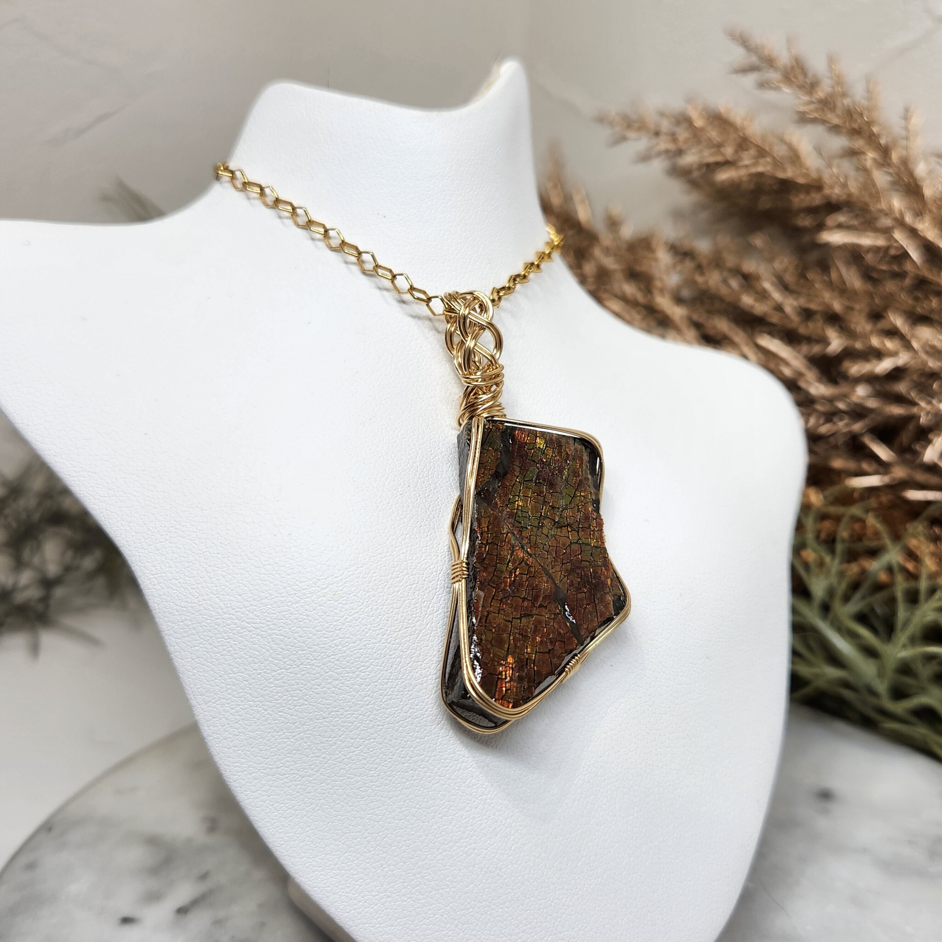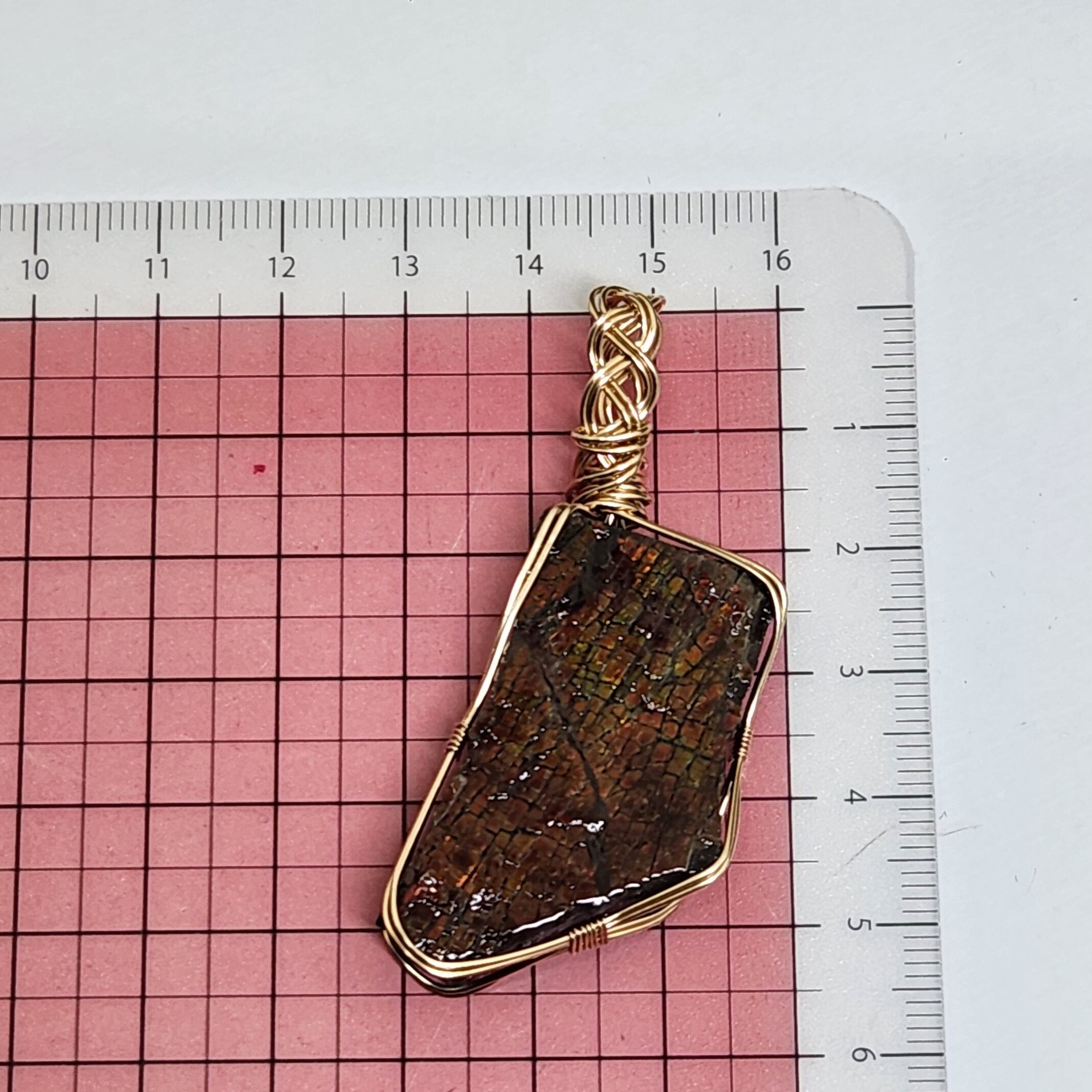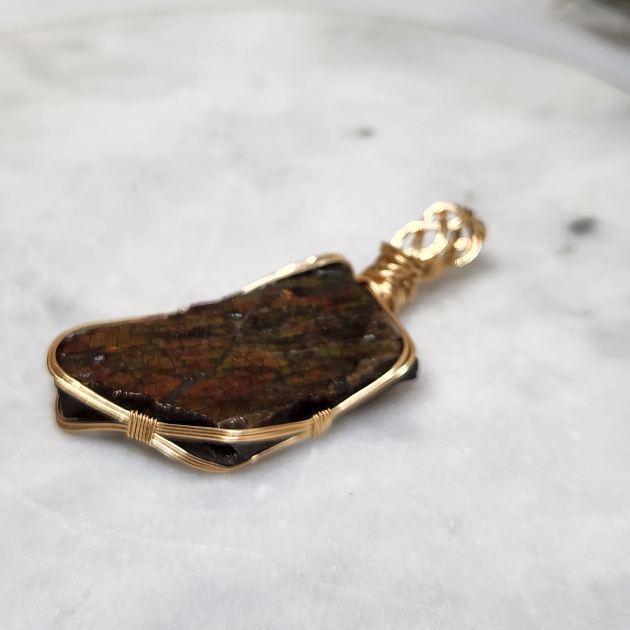 アンモライトの原石欠片を14kgfワイヤーでペンダントトップに仕立てました。
