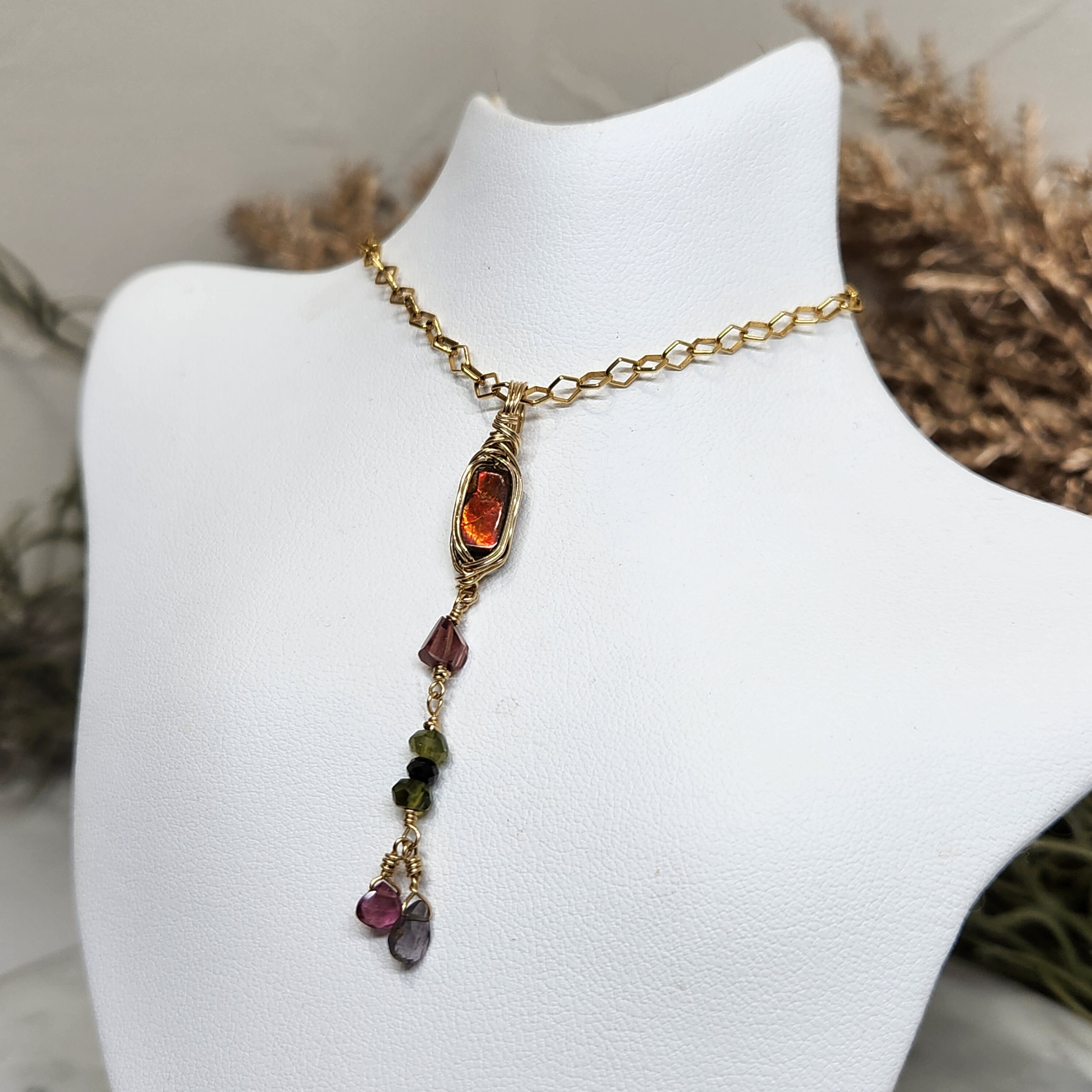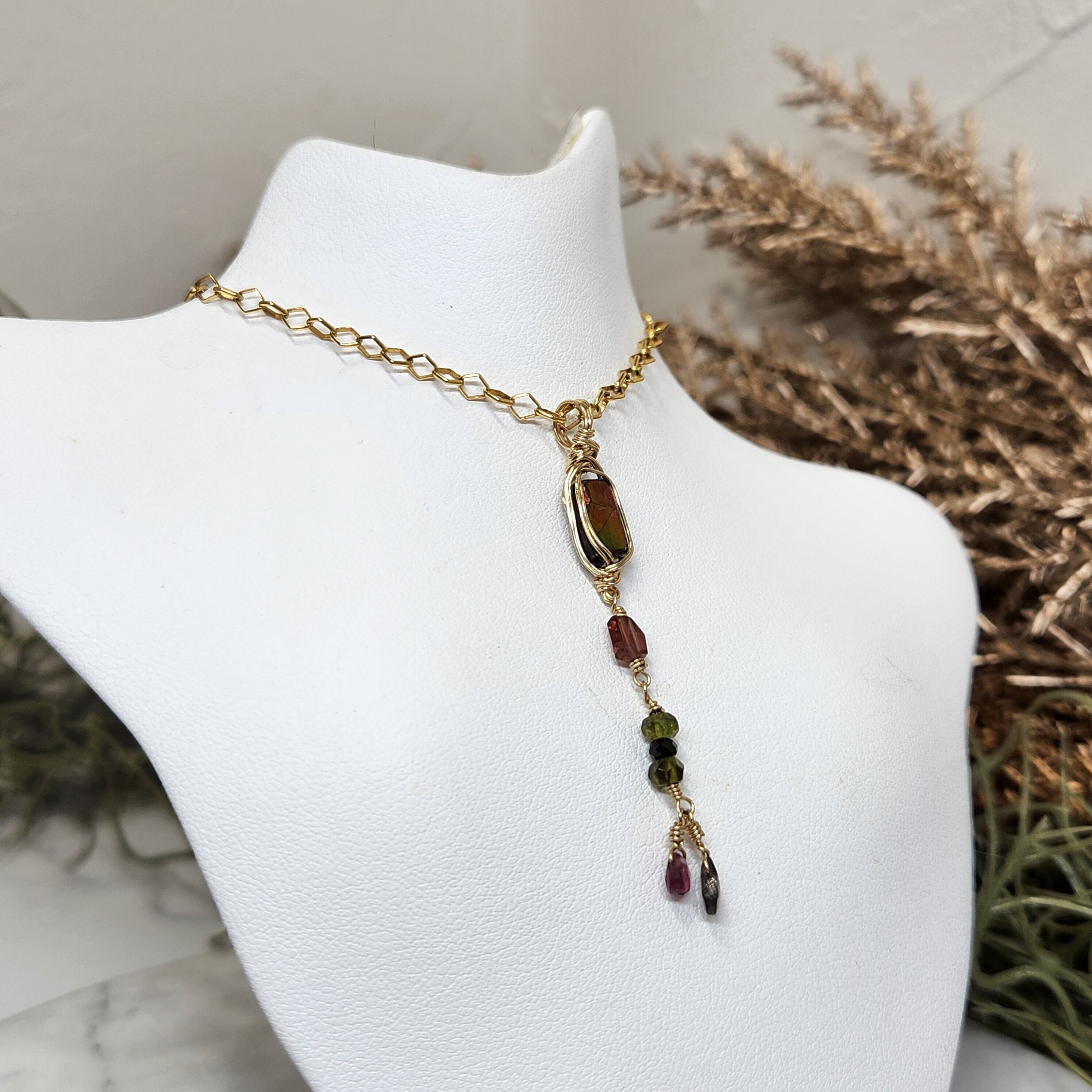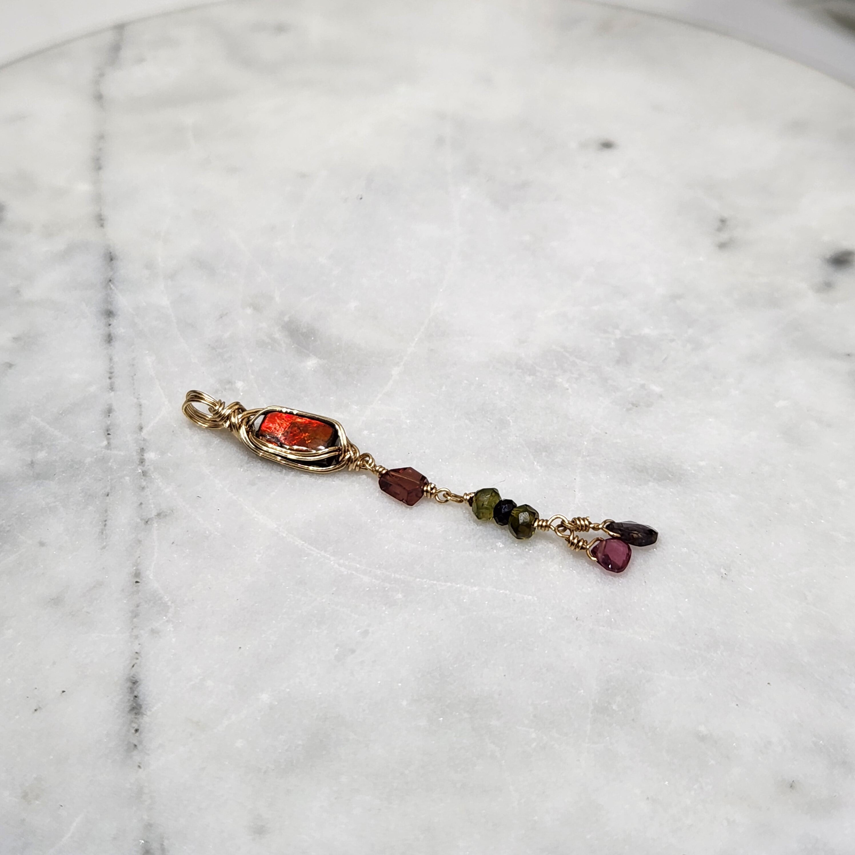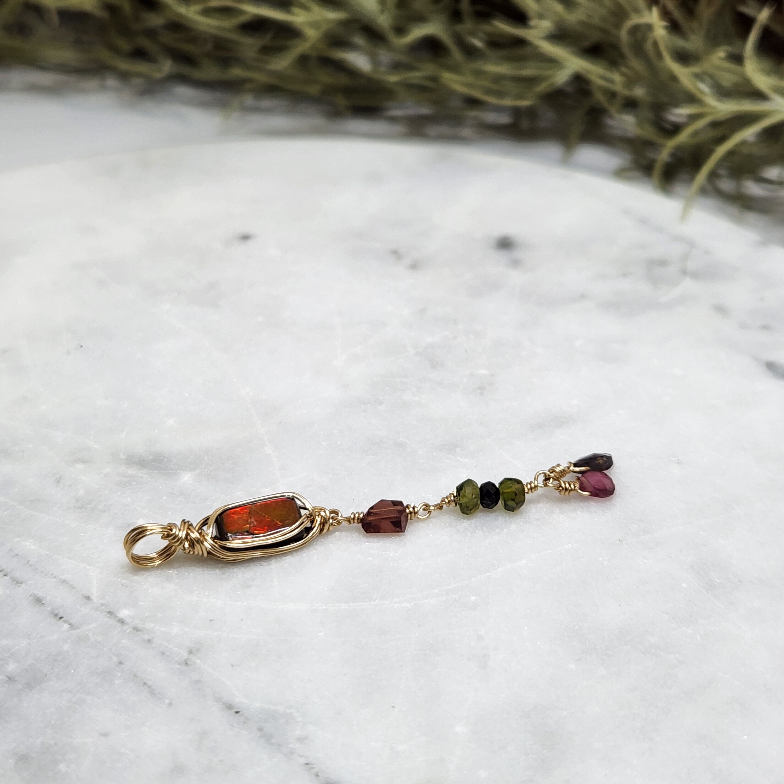 アンモライトに小粒の天然石をあわせ14kgfワイヤーでペンダントトップに仕立てました。