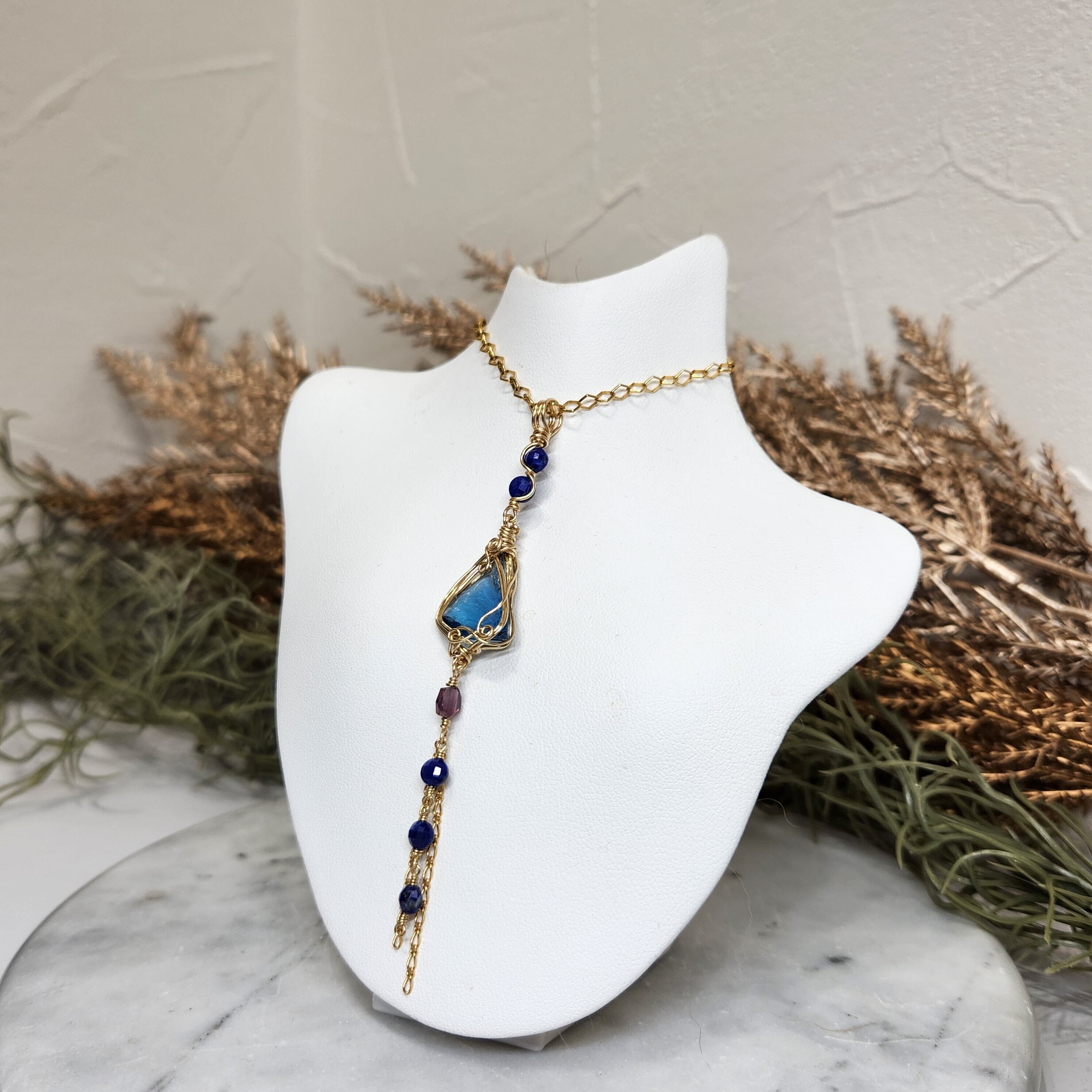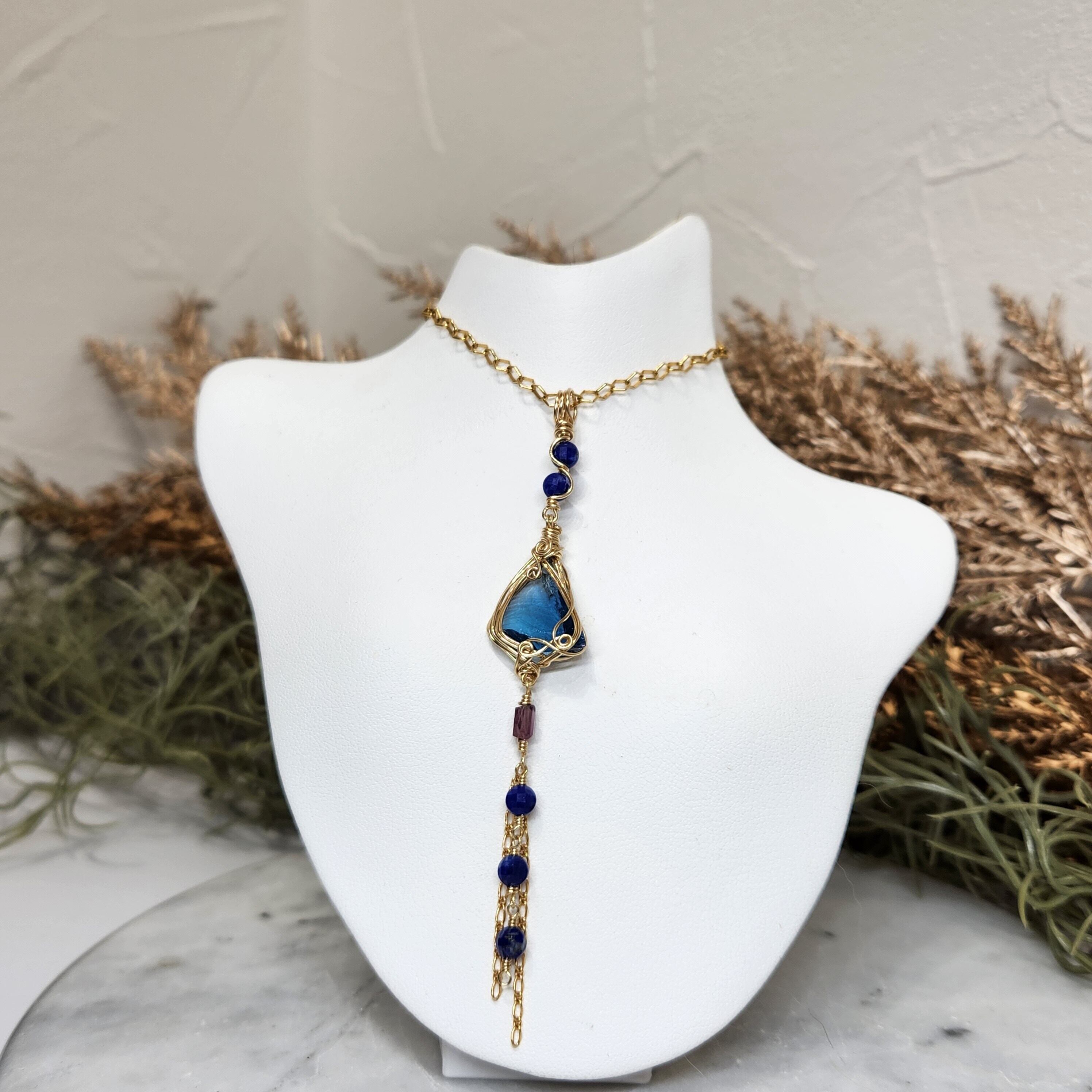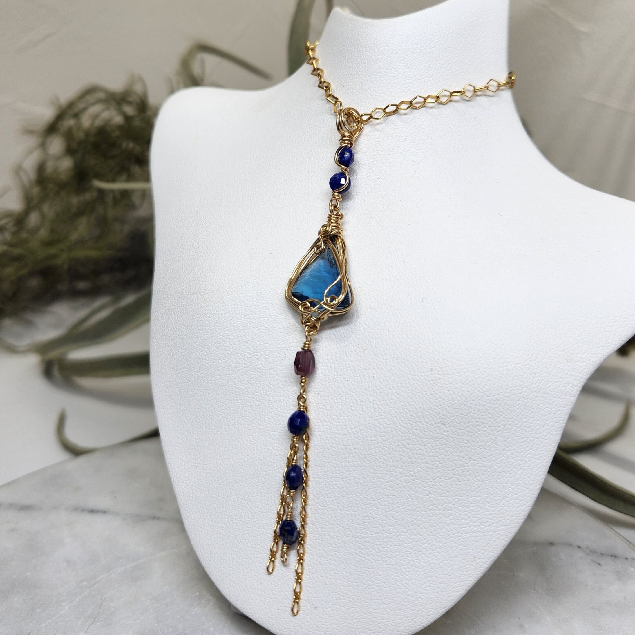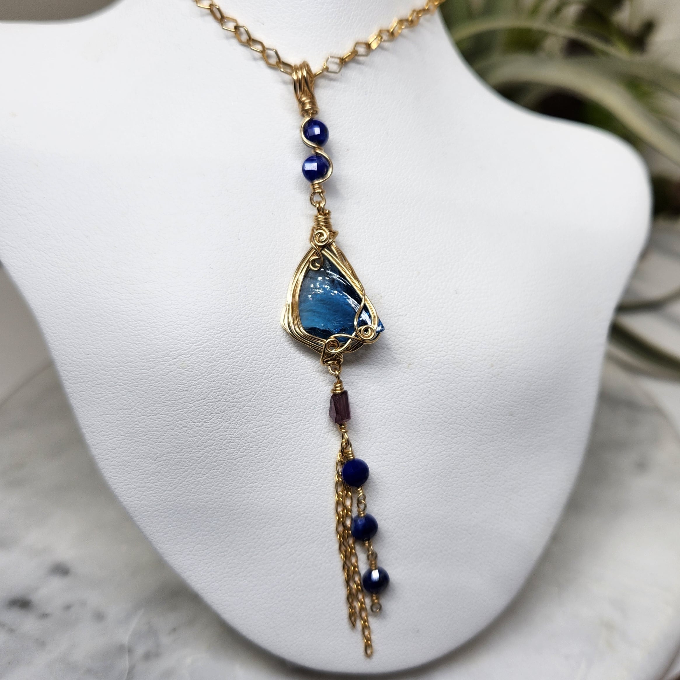 シエラ産アンダラクリスタルにラピスラズリとスピネルをあわせペンダントトップを仕立てました。装飾の素材は14kgf。