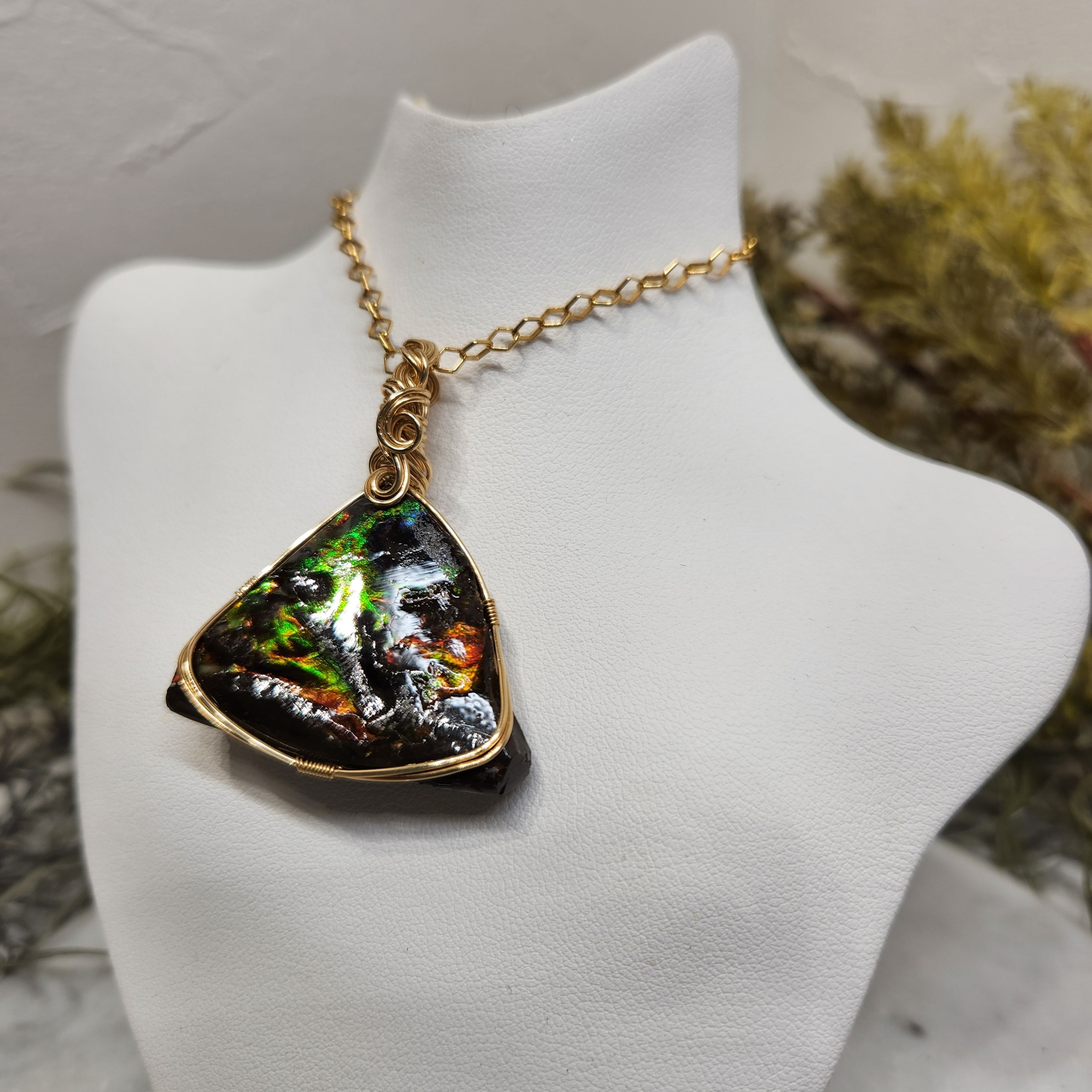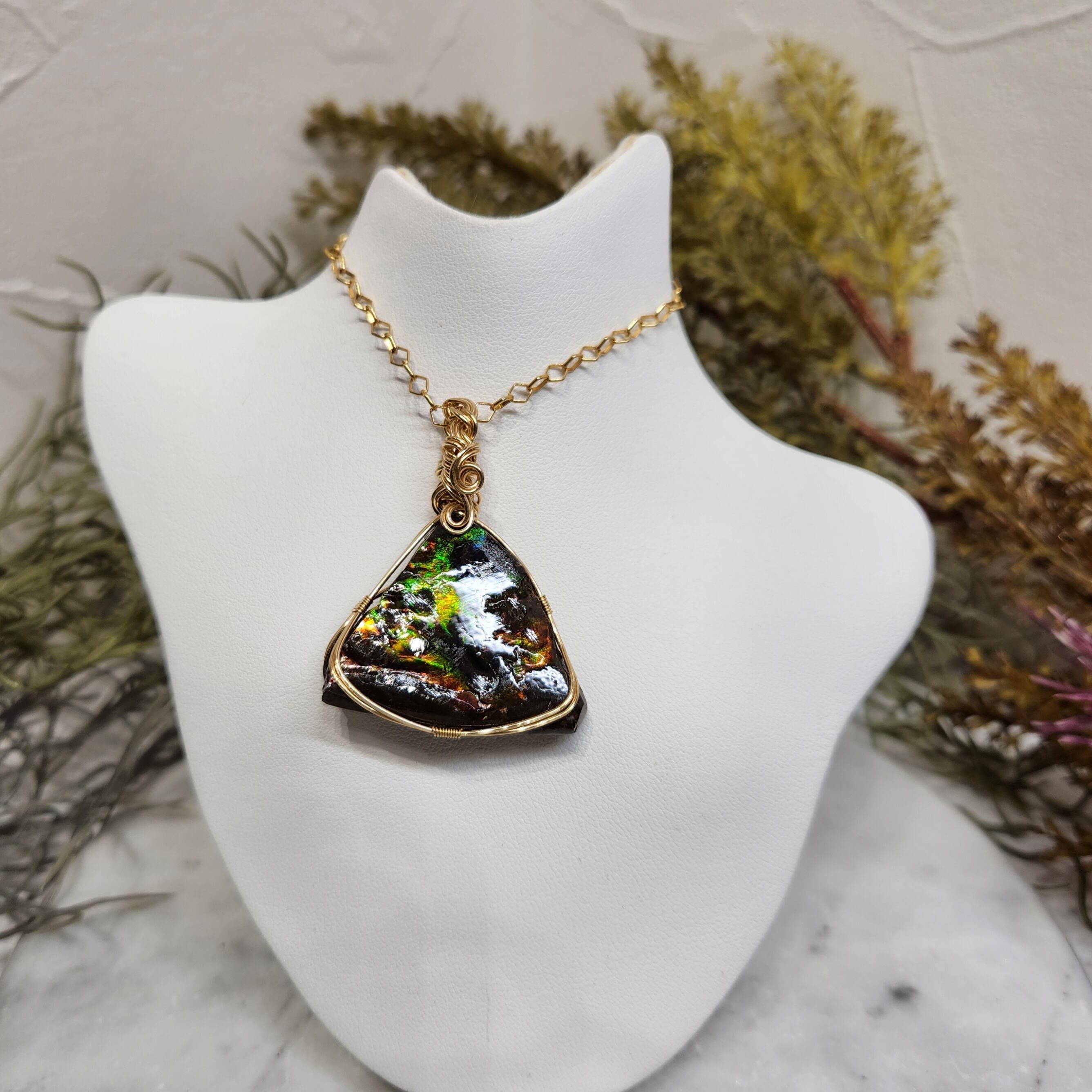 景色を切り取ったようなアンモライトの原石欠片を14kgfワイヤーでペンダントトップに仕立てました。